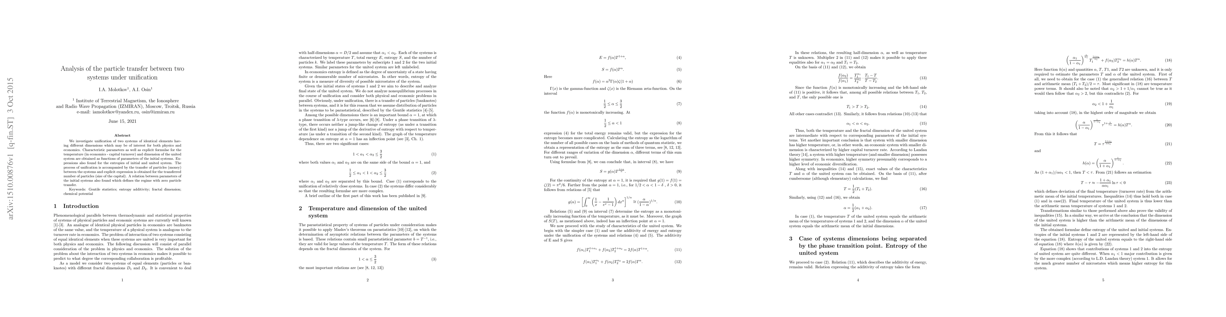 This paper analyzes the unification of two dimensionally different systems, deriving expressions for temperature (capital turnover) and dimension of the unified system as functions of initial parameters. It also finds explicit formulae for particle (capital) transfer and identifies a regime with zero particle transfer.