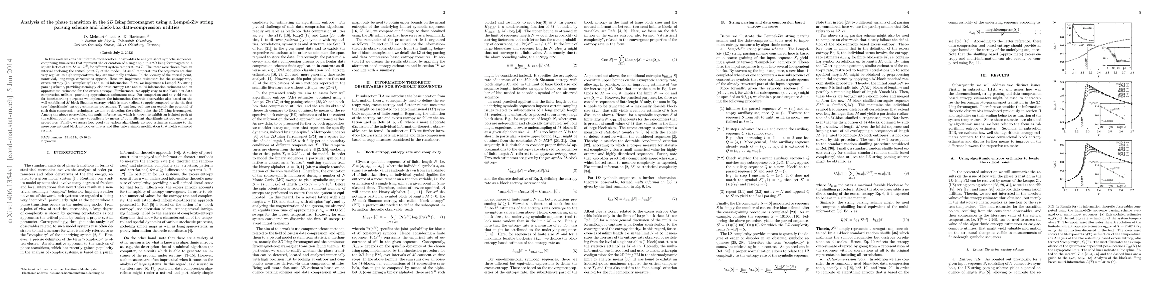 In this work we consider information-theoretical observables to analyze short symbolic sequences, comprising time-series that represent the orientation of a single spin in a $2D$ Ising ferromagnet on a square lattice of size $L^2=128^2$, for different system temperatures $T$. The latter were chosen from an interval enclosing the critical point $T_{\rm c}$ of the model. At small temperatures the sequences are thus very regular, at high temperatures they are maximally random. In the vicinity of the critical point, nontrivial, long-range correlations appear. Here, we implement estimators for the entropy rate, excess entropy (i.e. "complexity") and multi-information. First, we implement a Lempel-Ziv string parsing scheme, providing seemingly elaborate entropy rate and multi-information estimates and an approximate estimator for the excess entropy. Furthermore, we apply easy-to-use black-box data compression utilities, providing approximate estimators only. For comparison and to yield results for benchmarking purposes we implement the information-theoretic observables also based on the well-established M-block Shannon entropy, which is more tedious to apply compared to the the first two "algorithmic" entropy estimation procedures. To test how well one can exploit the potential of such data compression techniques, we aim at detecting the critical point of the $2D$ Ising ferromagnet. Among the above observables, the multi-information, which is known to exhibit an isolated peak at the critical point, is very easy to replicate by means of both efficient algorithmic entropy estimation procedures. Finally, we assess how good the various algorithmic entropy estimates compare to the more conventional block entropy estimates and illustrate a simple modification that yields enhanced results.