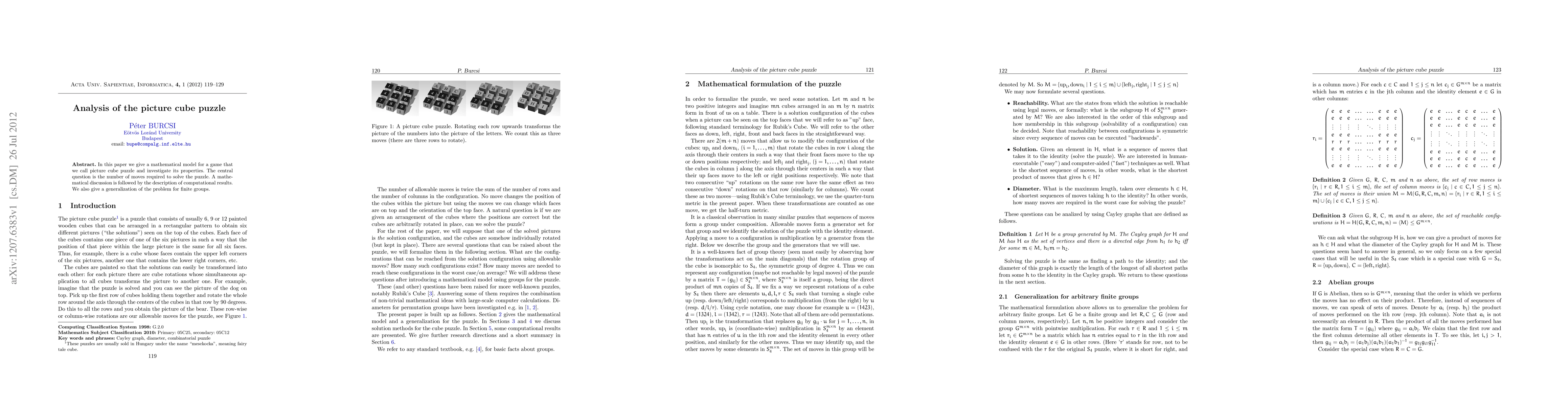 In this paper we give a mathematical model for a game that we call picture cube puzzle and investigate its properties. The central question is the number of moves required to solve the puzzle. A mathematical discussion is followed by the description of computational results. We also give a generalization of the problem for finite groups.
