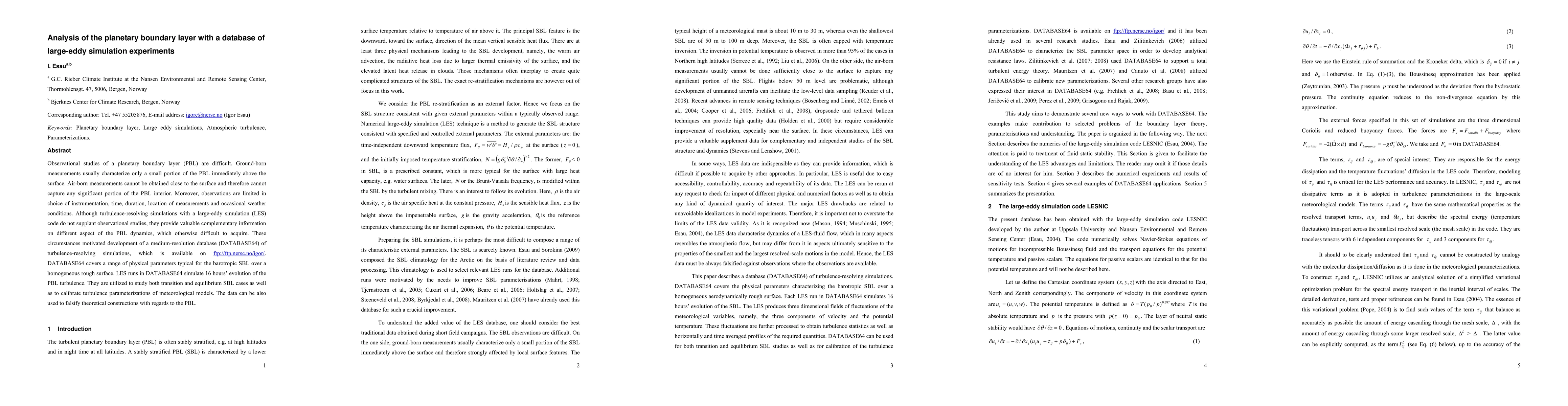 This paper analyzes the planetary boundary layer (PBL) using a large-eddy simulation database (DATABASE64) that complements observational studies. The database provides insights into PBL dynamics, covering transition and equilibrium stable boundary layer cases, and aids in calibrating meteorological models and testing theoretical models.