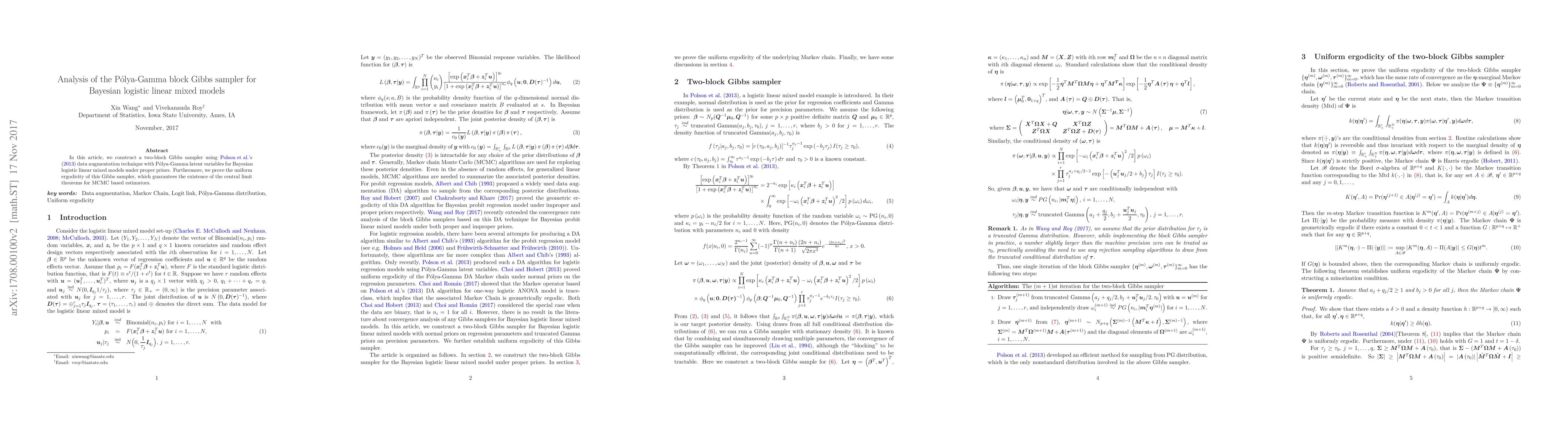 This paper develops a two-block Gibbs sampler for Bayesian logistic linear mixed models using the Polya-Gamma data augmentation technique, and proves its uniform ergodicity, ensuring the validity of central limit theorems for MCMC estimators.