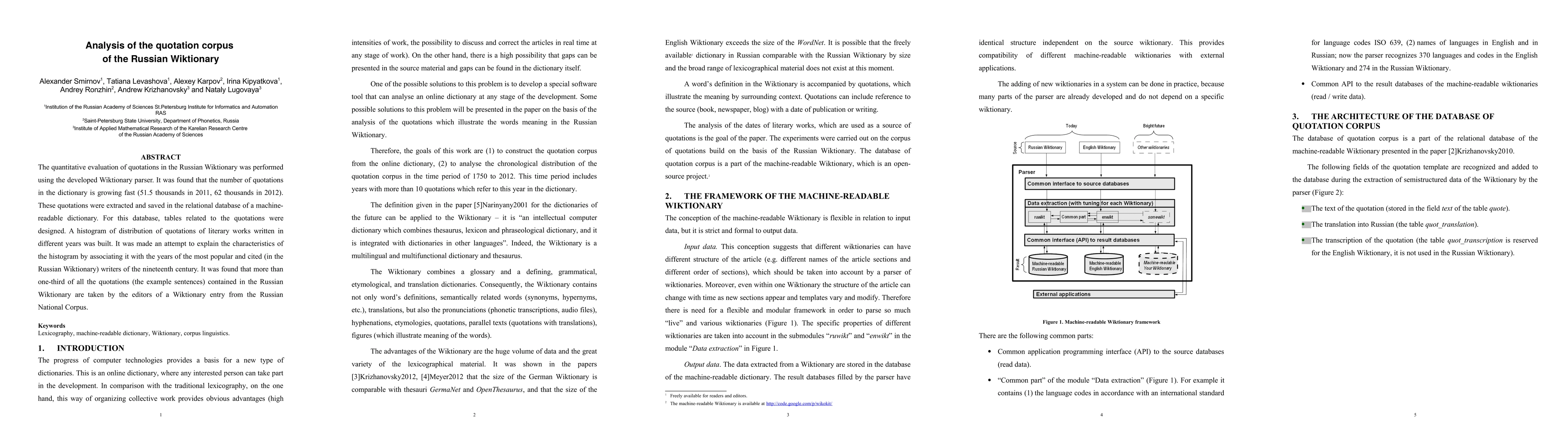 A study analyzed the growing number of quotations in the Russian Wiktionary, finding that more than a third of them are taken from the National Corpus, with a peak in 19th-century writers' works. The analysis provides insights into the linguistic patterns and historical trends in Russian literature.