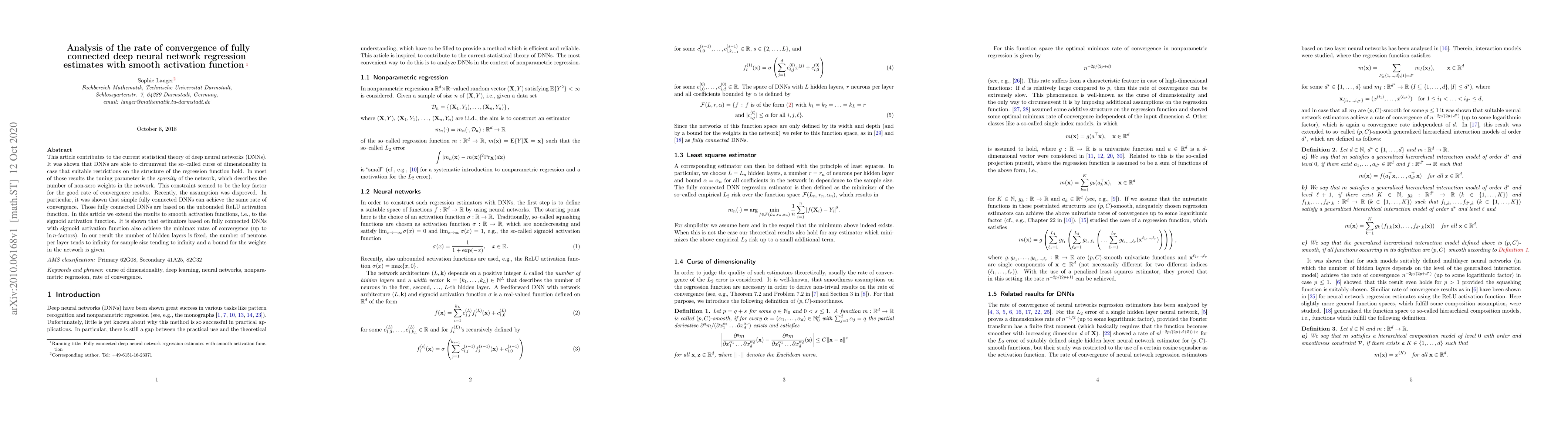 This paper extends the convergence rate analysis of fully connected deep neural networks (DNNs) to smooth activation functions like sigmoid, showing they achieve minimax rates of convergence similar to those with ReLU activation, under certain structural conditions on the regression function. The study disproves the necessity of sparsity for optimal convergence rates.