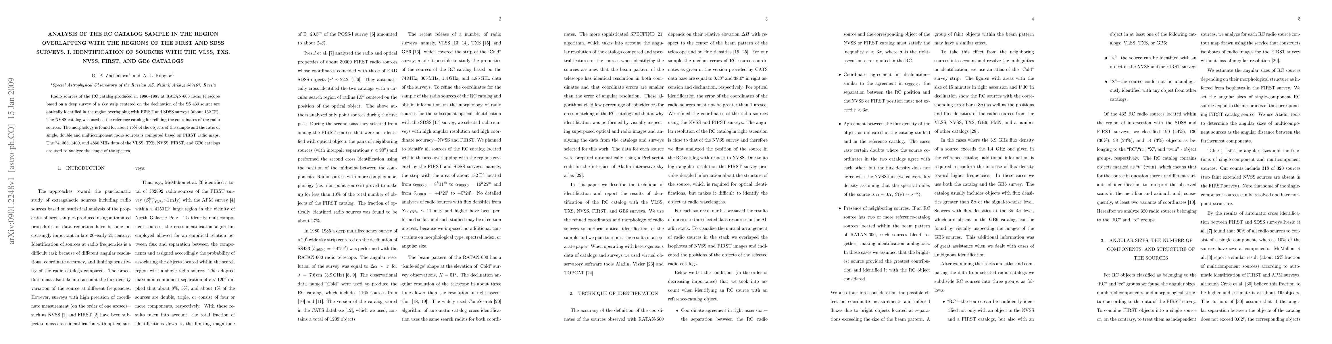 Researchers analyzed radio sources from the RC catalog in an overlapping region with FIRST and SDSS surveys, finding 75% with visible morphology and varying spectral shapes across multiple catalogs.