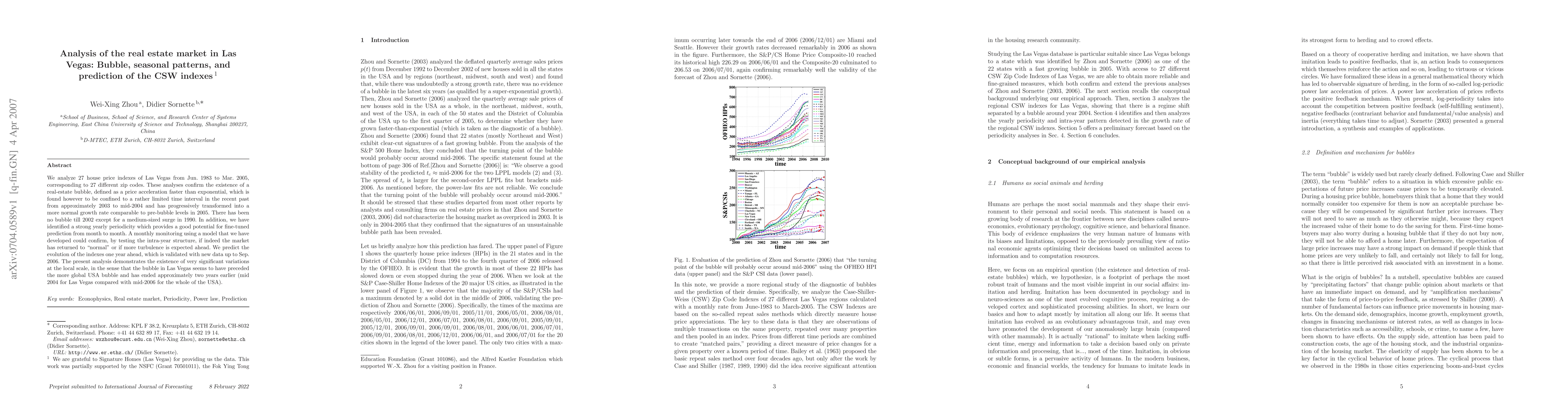 We analyze 27 house price indexes of Las Vegas from Jun. 1983 to Mar. 2005, corresponding to 27 different zip codes. These analyses confirm the existence of a real-estate bubble, defined as a price acceleration faster than exponential, which is found however to be confined to a rather limited time interval in the recent past from approximately 2003 to mid-2004 and has progressively transformed into a more normal growth rate comparable to pre-bubble levels in 2005. There has been no bubble till 2002 except for a medium-sized surge in 1990. In addition, we have identified a strong yearly periodicity which provides a good potential for fine-tuned prediction from month to month. A monthly monitoring using a model that we have developed could confirm, by testing the intra-year structure, if indeed the market has returned to ``normal'' or if more turbulence is expected ahead. We predict the evolution of the indexes one year ahead, which is validated with new data up to Sep. 2006. The present analysis demonstrates the existence of very significant variations at the local scale, in the sense that the bubble in Las Vegas seems to have preceded the more global USA bubble and has ended approximately two years earlier (mid 2004 for Las Vegas compared with mid-2006 for the whole of the USA).