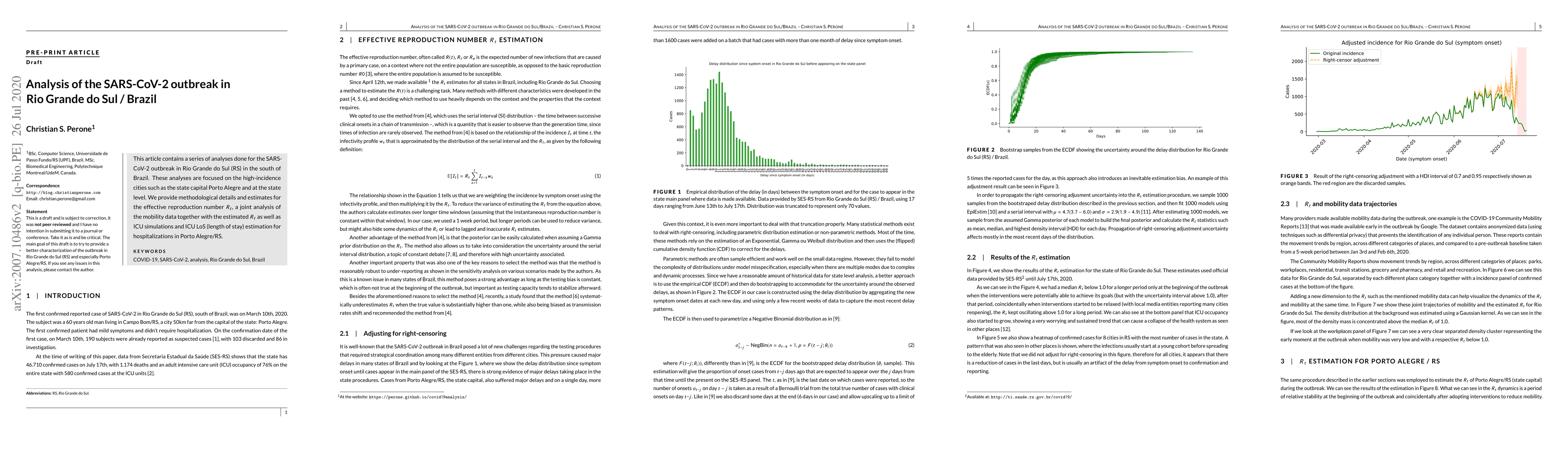 This article contains a series of analyses done for the SARS-CoV-2 outbreak in Rio Grande do Sul (RS) in the south of Brazil. These analyses are focused on the high-incidence cities such as the state capital Porto Alegre and at the state level. We provide methodological details and estimates for the effective reproduction number $R_t$, a joint analysis of the mobility data together with the estimated $R_t$ as well as ICU simulations and ICU LoS (length of stay) estimation for hospitalizations in Porto Alegre/RS.