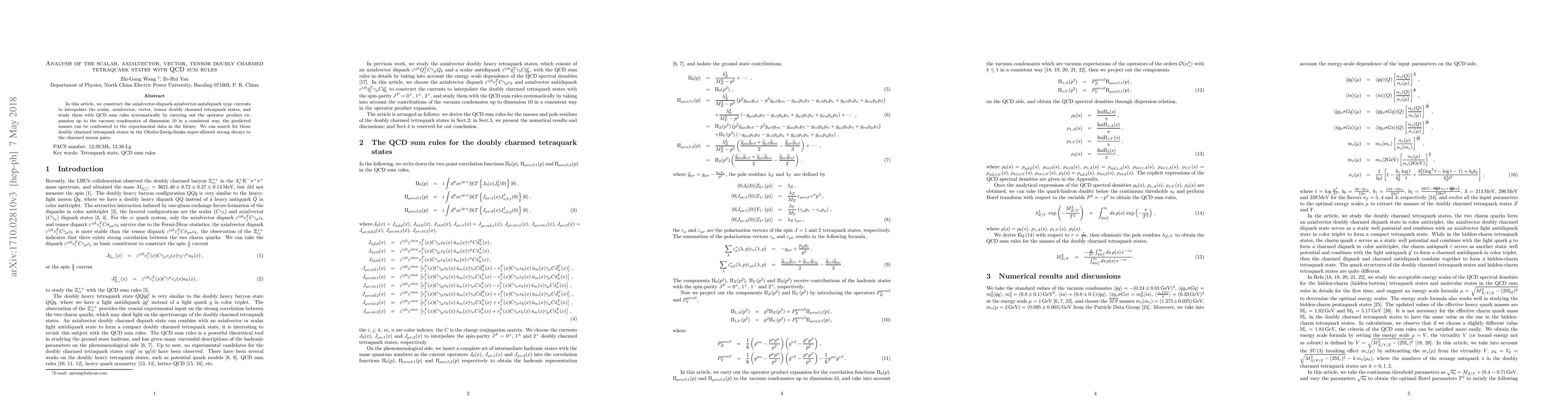 This paper constructs specific currents to interpolate scalar, axialvector, vector, and tensor doubly charmed tetraquark states and analyzes them using QCD sum rules, predicting their masses for future experimental validation. The study also explores potential Okubo-Zweig-Iizuka super-allowed strong decays to charmed meson pairs.