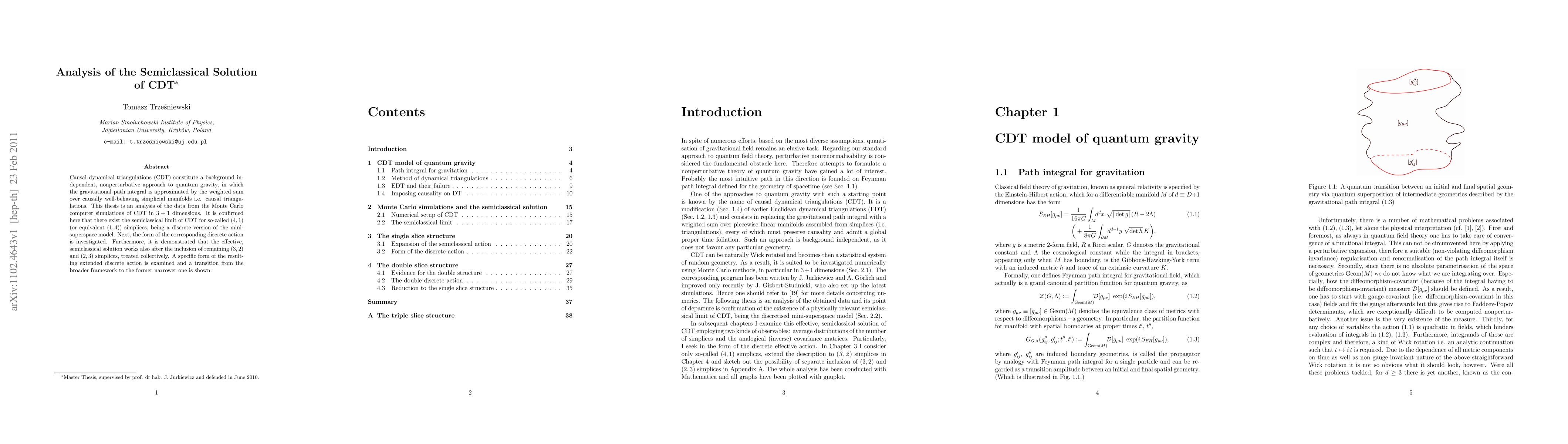 Causal dynamical triangulations (CDT) constitute a background independent, nonperturbative approach to quantum gravity, in which the gravitational path integral is approximated by the weighted sum over causally well-behaving simplicial manifolds i.e. causal triangulations. This thesis is an analysis of the data from the Monte Carlo computer simulations of CDT in 3+1 dimensions. It is confirmed here that there exist the semiclassical limit of CDT for so-called (4,1) (or equivalent (1,4)) simplices, being a discrete version of the mini-superspace model. Next, the form of the corresponding discrete action is investigated. Furthermore, it is demonstrated that the effective, semiclassical solution works also after the inclusion of remaining (3,2) and (2,3) simplices, treated collectively. A specific form of the resulting extended discrete action is examined and a transition from the broader framework to the former narrower one is shown.
