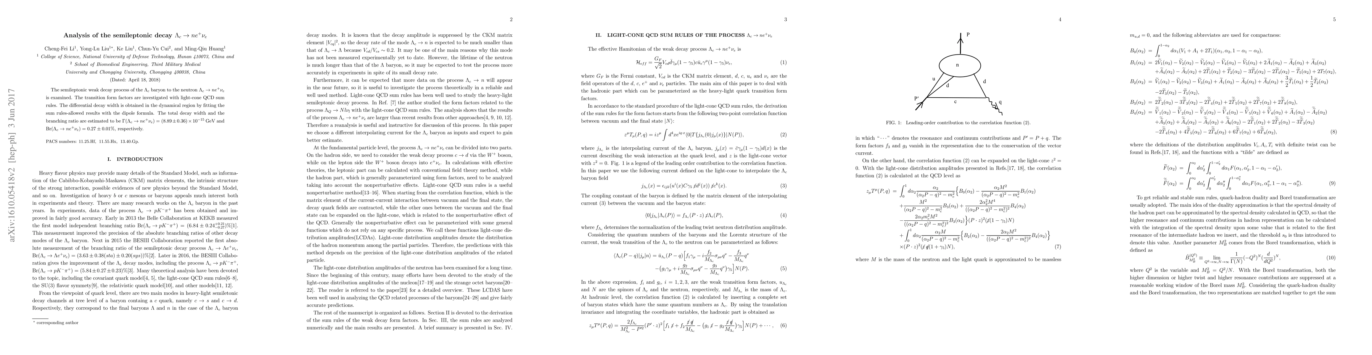 The semileptonic weak decay process of the $\Lambda_c$ baryon to the neutron $\Lambda_c\rightarrow ne^+\nu_e$ is examined. The transition form factors are investigated with light-cone QCD sum rules. The differential decay width is obtained in the dynamical region by fitting the sum rules-allowed results with the dipole formula. The total decay width and the branching ratio are estimated to be $\Gamma(\Lambda_c\rightarrow ne^+\nu_e)=(8.57\pm0.41)\times10^{-15}\,\mbox{GeV}$ and $\mbox{Br}(\Lambda_c\rightarrow ne^+\nu_e)=0.26\pm0.01\%$, respectively.