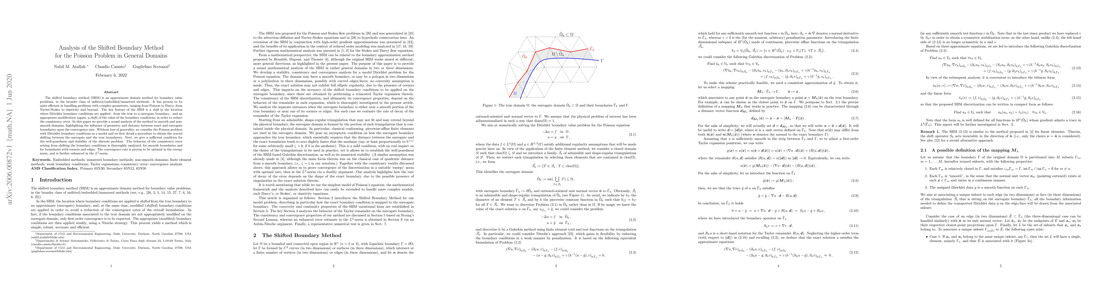 The shifted boundary method for solving Poisson problems in general domains is analyzed, showing optimal convergence rates in energy and L^2 norms with minimal consistency errors.