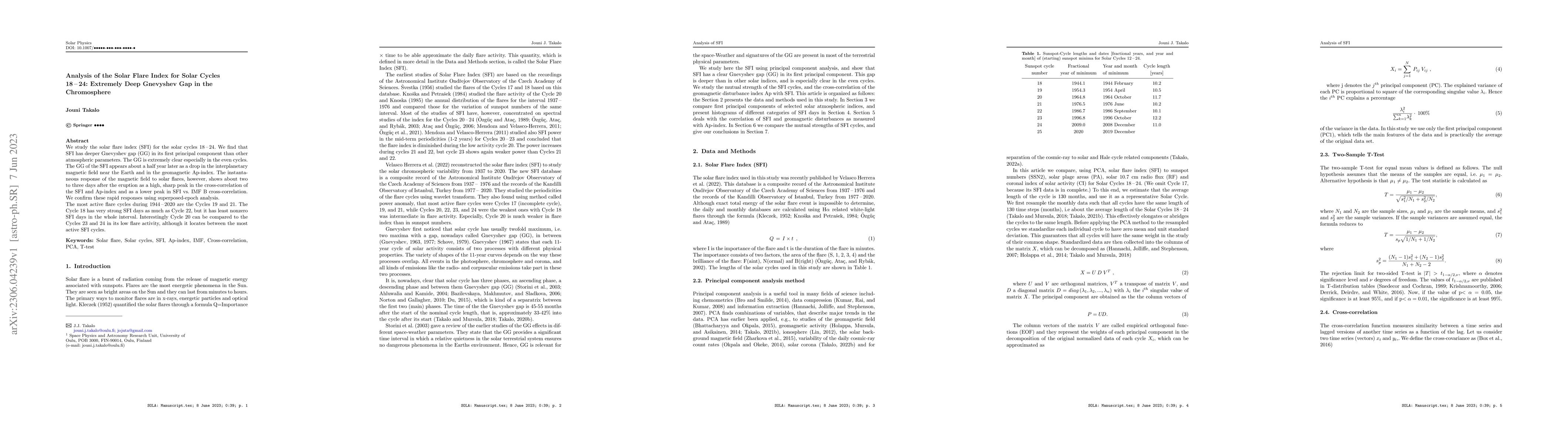 This paper analyzes the solar flare index (SFI) for solar cycles 18-24 and identifies an extremely deep Gnevyshev gap in the SFI's first principal component, especially pronounced in even cycles. The study confirms rapid magnetic field responses to solar flares, with notable peaks in cross-correlations appearing two to three days post-eruption.