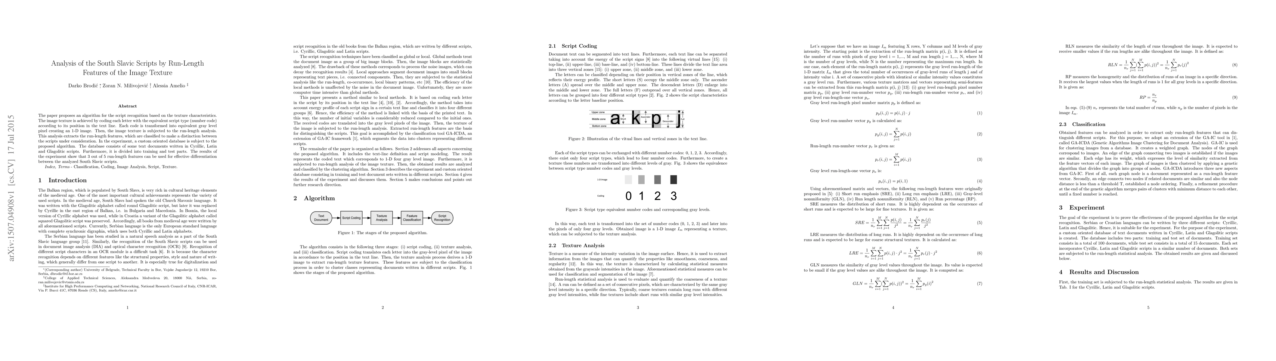 The paper proposes an algorithm for the script recognition based on the texture characteristics. The image texture is achieved by coding each letter with the equivalent script type (number code) according to its position in the text line. Each code is transformed into equivalent gray level pixel creating an 1-D image. Then, the image texture is subjected to the run-length analysis. This analysis extracts the run-length features, which are classified to make a distinction between the scripts under consideration. In the experiment, a custom oriented database is subject to the proposed algorithm. The database consists of some text documents written in Cyrillic, Latin and Glagolitic scripts. Furthermore, it is divided into training and test parts. The results of the experiment show that 3 out of 5 run-length features can be used for effective differentiation between the analyzed South Slavic scripts.