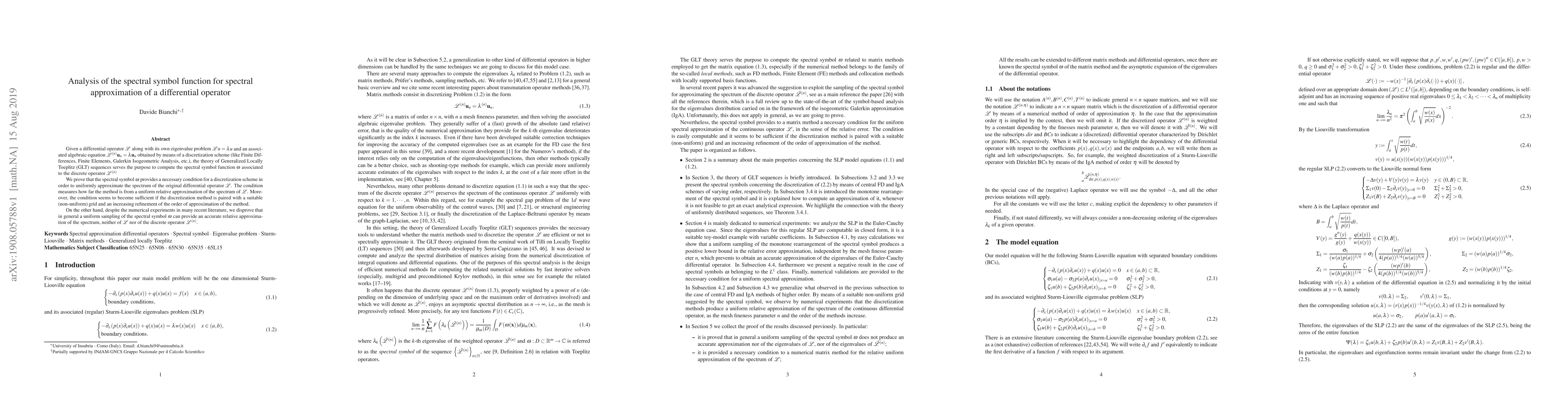 This paper analyzes the spectral symbol function $\omega$ for spectral approximation of a differential operator $\mathcal{L}$, proving it as a necessary condition for uniform spectrum approximation by discretization schemes. It also disproves that uniform sampling of $\omega$ generally provides an accurate relative approximation of the spectrum.