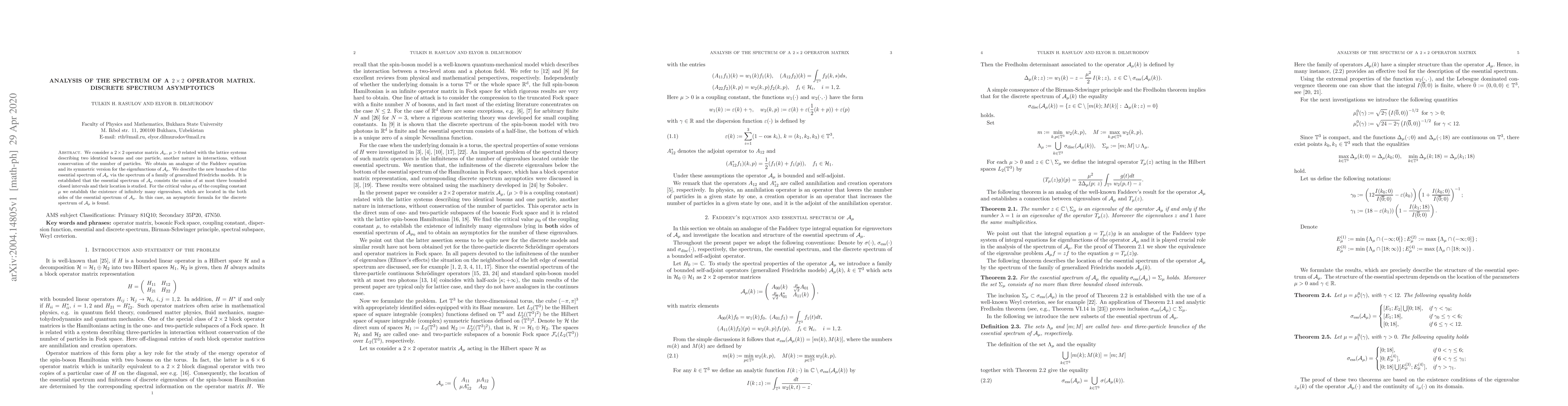 Researchers studied a 2x2 operator matrix related to lattice systems with two identical bosons and one particle, finding the essential spectrum consists of up to three bounded intervals and an asymptotic formula for discrete spectrum exists at critical coupling constant value.
