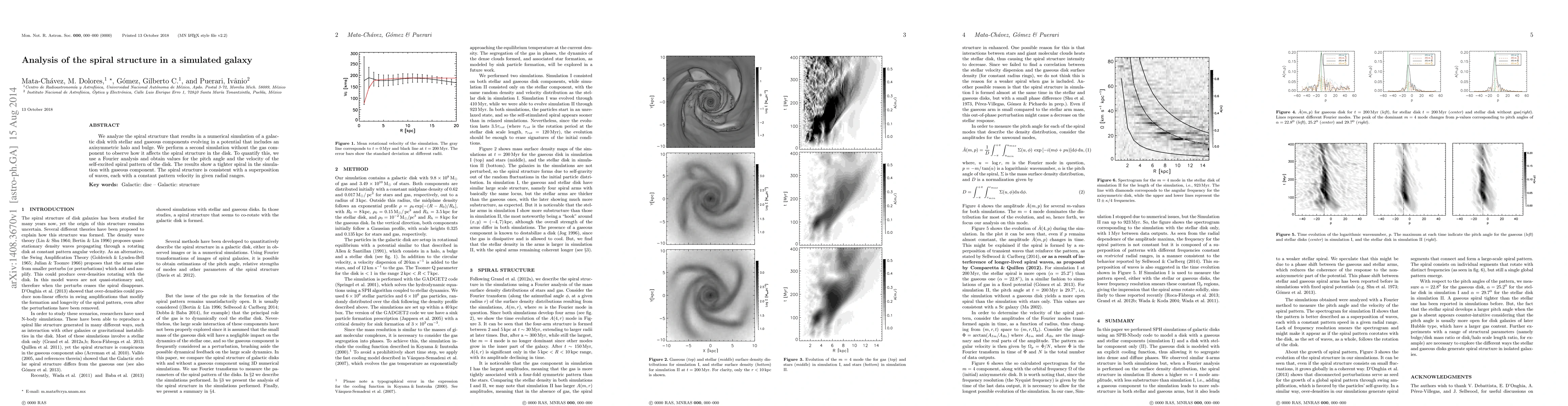 This paper analyzes the spiral structure in a simulated galaxy, comparing simulations with and without a gaseous component. Using Fourier analysis, the study finds a tighter spiral in the gas-present simulation, indicating the gas influences the spiral pattern's pitch angle and velocity.