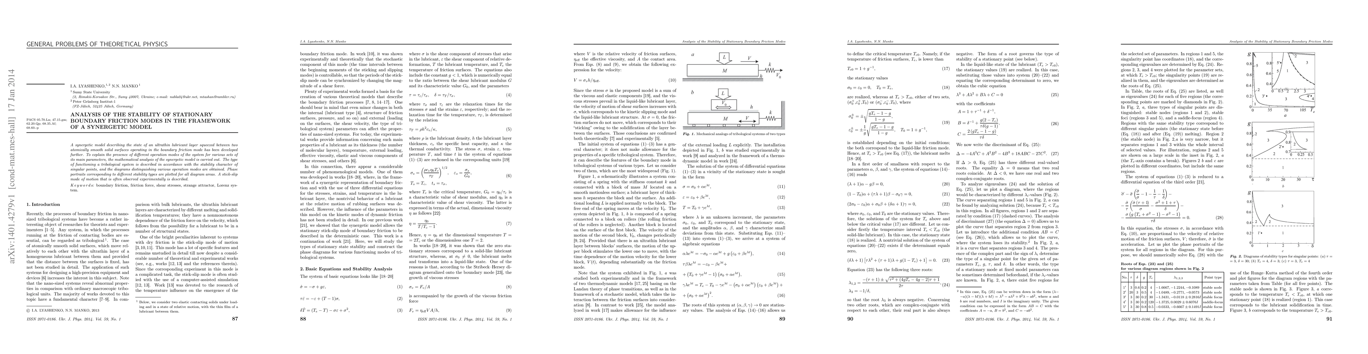A synergetic model describing the state of an ultrathin lubricant layer squeezed between two atomically smooth solid surfaces operating in the boundary friction mode has been developed further. To explain the presence of different operation modes of the system for various sets of its main parameters, the mathematical analysis of the synergetic model is carried out. The type of functioning a tribological system is described in accordance with the stability character of singular points, and the diagrams distinguishing various operation modes are obtained. Phase portraits corresponding to different stability types are plotted for all diagram areas. A stick-slip mode of motion that is often observed experimentally is described.