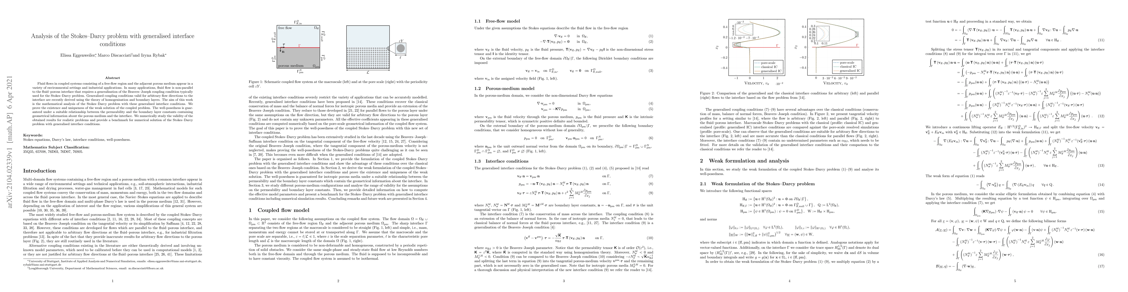 This paper mathematically analyzes the Stokes-Darcy problem with generalised interface conditions for fluid flow in coupled systems, proving the existence and uniqueness of the weak solution under specific conditions. Numerical studies validate the theoretical results and provide benchmarks for solving such problems.