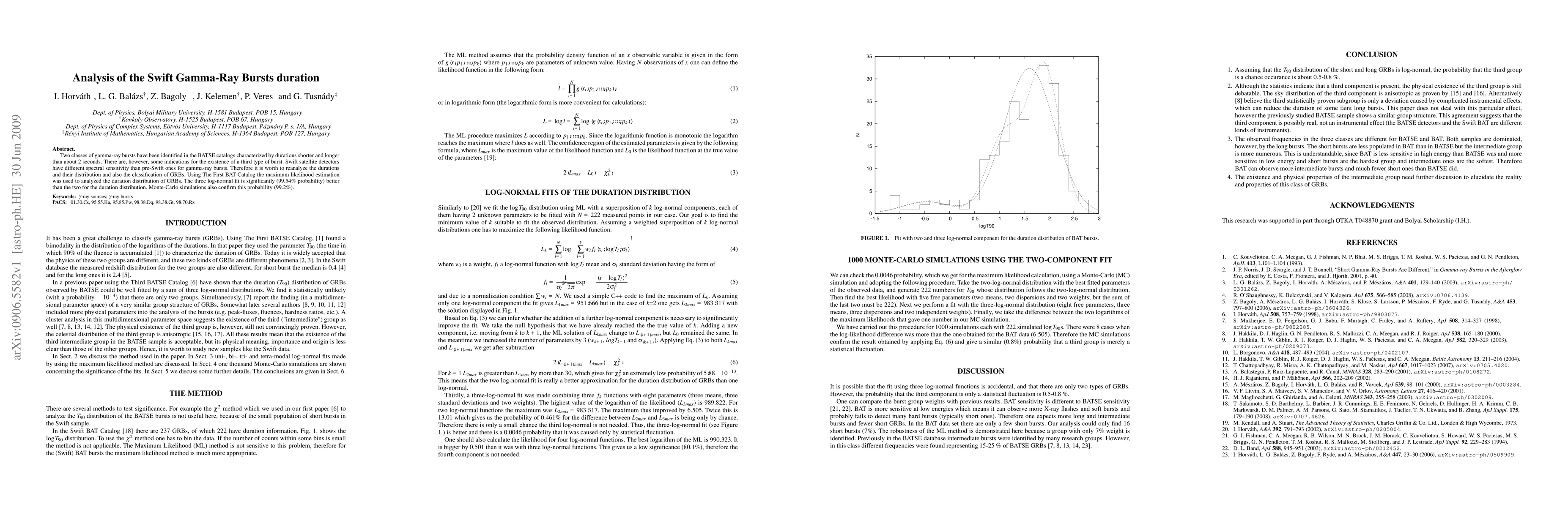 This paper analyzes the duration distribution of gamma-ray bursts (GRBs) using data from the Swift satellite, finding evidence for a third class of bursts. The three log-normal fit model is significantly better than the traditional two-class model, supported by maximum likelihood estimation and Monte-Carlo simulations.