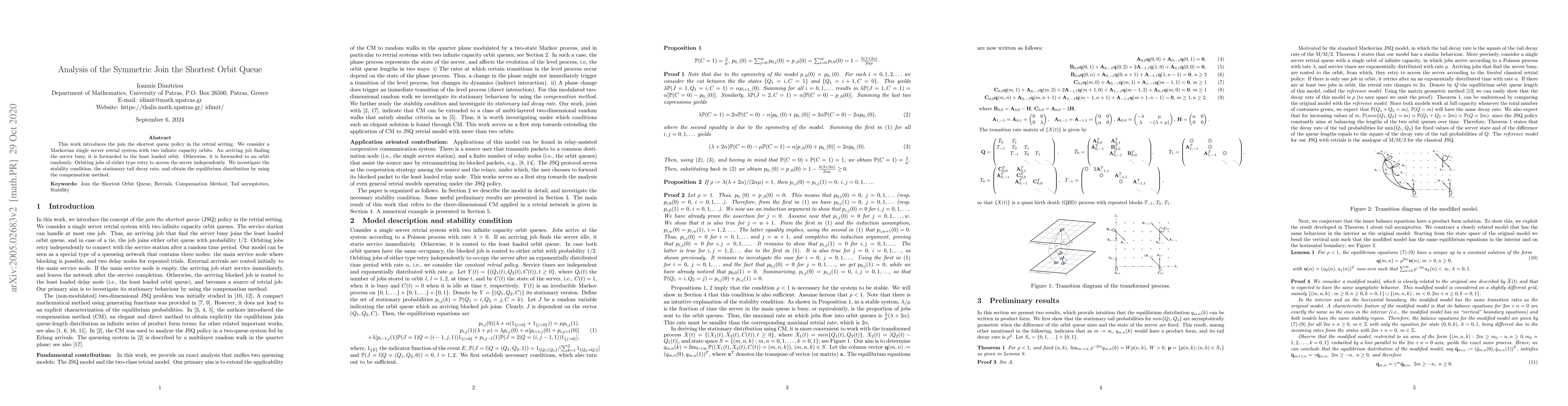 This paper analyzes a Markovian single server retrial system with two orbits, introducing a join the shortest queue policy. It investigates stability, tail decay rates, and equilibrium distribution using the compensation method.