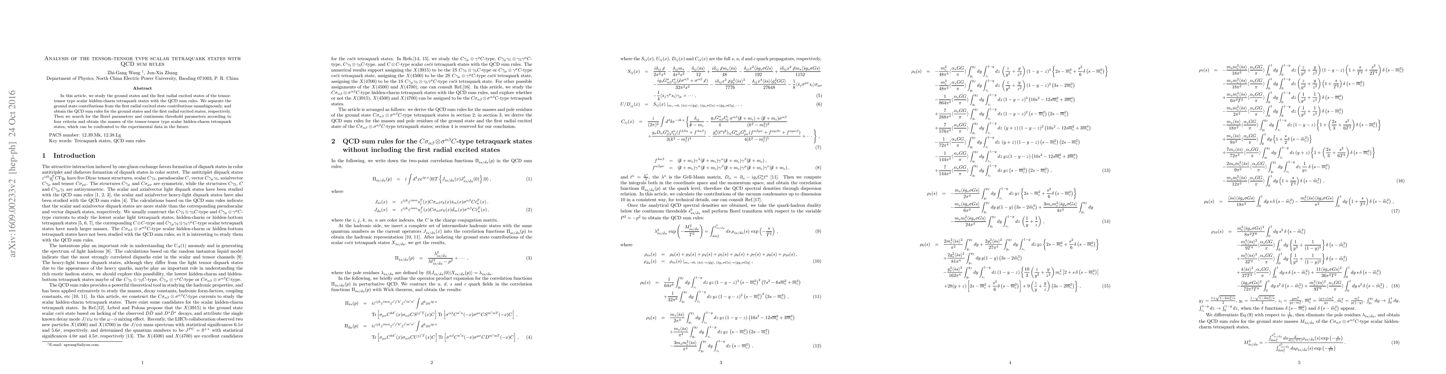 This paper investigates the ground and first radial excited states of tensor-tensor type scalar hidden-charm tetraquark states using QCD sum rules, distinguishing contributions from each state. The study determines the masses of these tetraquarks, aiming for future experimental validation.