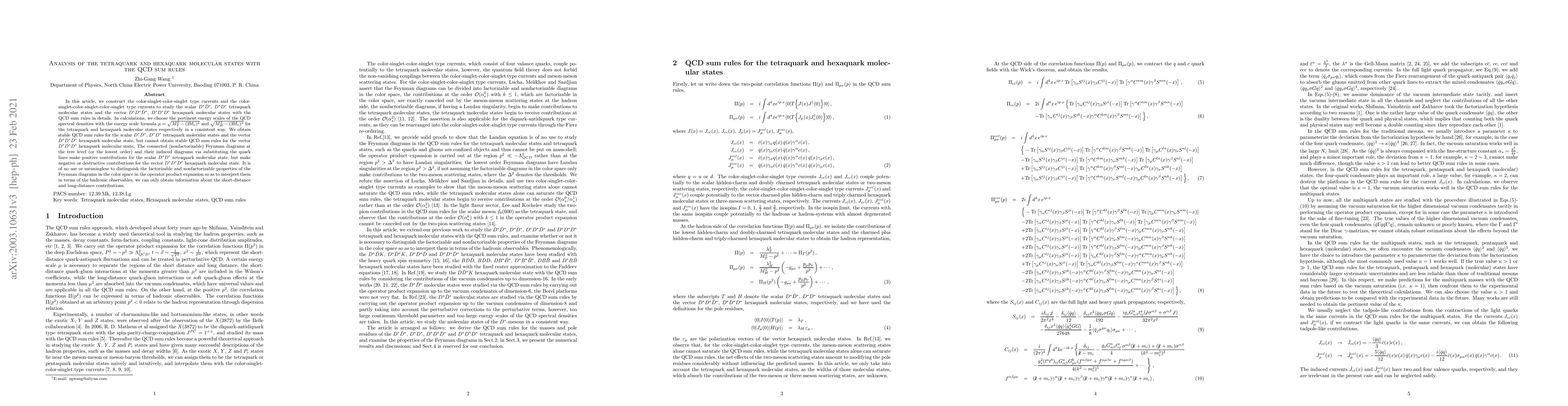 In this article, we construct the color-singlet-color-singlet type currents and the color-singlet-color-singlet-color-singlet type currents to study the scalar $D^*\bar{D}^*$, $D^*D^*$ tetraquark molecular states and the vector $D^*D^*\bar{D}^*$, $D^*D^*D^*$ hexaquark molecular states with the QCD sum rules in details. In calculations, we choose the pertinent energy scales of the QCD spectral densities with the energy scale formula $\mu=\sqrt{M^2_{T}-(2{\mathbb{M}}_c)^2}$ and $\sqrt{M^2_{H}-(3{\mathbb{M}}_c)^2}$ for the tetraquark and hexaquark molecular states respectively in a consistent way. We obtain stable QCD sum rules for the scalar $D^*\bar{D}^*$, $D^*D^*$ tetraquark molecular states and the vector $D^*D^*\bar{D}^*$ hexaquark molecular state, but cannot obtain stable QCD sum rules for the vector $D^*D^*D^*$ hexaquark molecular state. The connected (nonfactorizable) Feynman diagrams at the tree level (or the lowest order) and their induced diagrams via substituting the quark lines make positive contributions for the scalar $D^*D^*$ tetraquark molecular state, but make negative or destructive contributions for the vector $D^*D^*D^*$ hexaquark molecular state. It is of no use or meaningless to distinguish the factorizable and nonfactorizable properties of the Feynman diagrams in the color space in the operator product expansion so as to interpret them in terms of the hadronic observables, we can only obtain information about the short-distance and long-distance contributions.