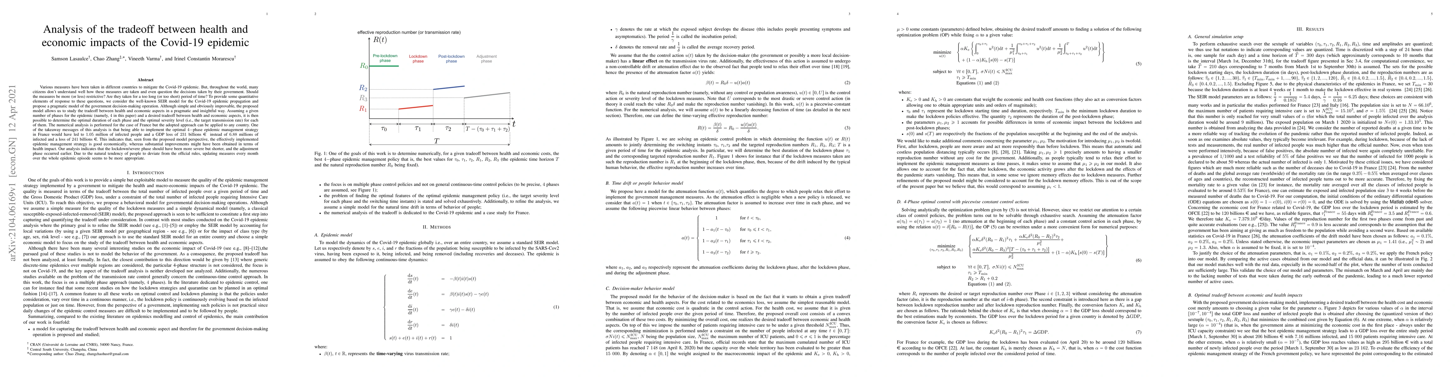 Various measures have been taken in different countries to mitigate the Covid-19 epidemic. But, throughout the world, many citizens don't understand well how these measures are taken and even question the decisions taken by their government. Should the measures be more (or less) restrictive? Are they taken for a too long (or too short) period of time? To provide some quantitative elements of response to these questions, we consider the well-known SEIR model for the Covid-19 epidemic propagation and propose a pragmatic model of the government decision-making operation. Although simple and obviously improvable, the proposed model allows us to study the tradeoff between health and economic aspects in a pragmatic and insightful way. Assuming a given number of phases for the epidemic and a desired tradeoff between health and economic aspects, it is then possible to determine the optimal duration of each phase and the optimal severity level for each of them. The numerical analysis is performed for the case of France but the adopted approach can be applied to any country. One of the takeaway messages of this analysis is that being able to implement the optimal 4-phase epidemic management strategy in France would have led to 1.05 million infected people and a GDP loss of 231 billion euro instead of 6.88 million of infected and a loss of 241 billion euro. This indicates that, seen from the proposed model perspective, the effectively implemented epidemic management strategy is good economically, whereas substantial improvements might have been obtained in terms of health impact. Our analysis indicates that the lockdown/severe phase should have been more severe but shorter, and the adjustment phase occurred earlier. Due to the natural tendency of people to deviate from the official rules, updating measures every month over the whole epidemic episode seems to be more appropriate.