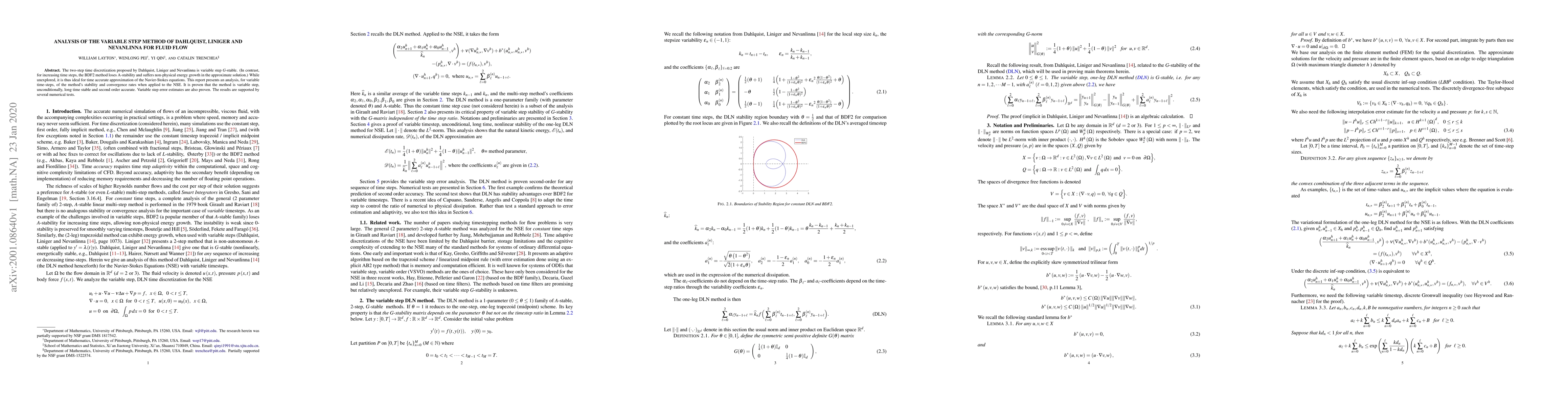 The two-step time discretization proposed by Dahlquist, Liniger and Nevanlinna is variable step $G$-stable. (In contrast, for increasing time steps, the BDF2 method loses $A$-stability and suffers non-physical energy growth in the approximate solution.) While unexplored, it is thus ideal for time accurate approximation of the Navier-Stokes equations. This report presents an analysis, for variable time-steps, of the method's stability and convergence rates when applied to the NSE. It is proven that the method is variable step, unconditionally, long time stable and second order accurate. Variable step error estimates are also proven. The results are supported by several numerical tests.