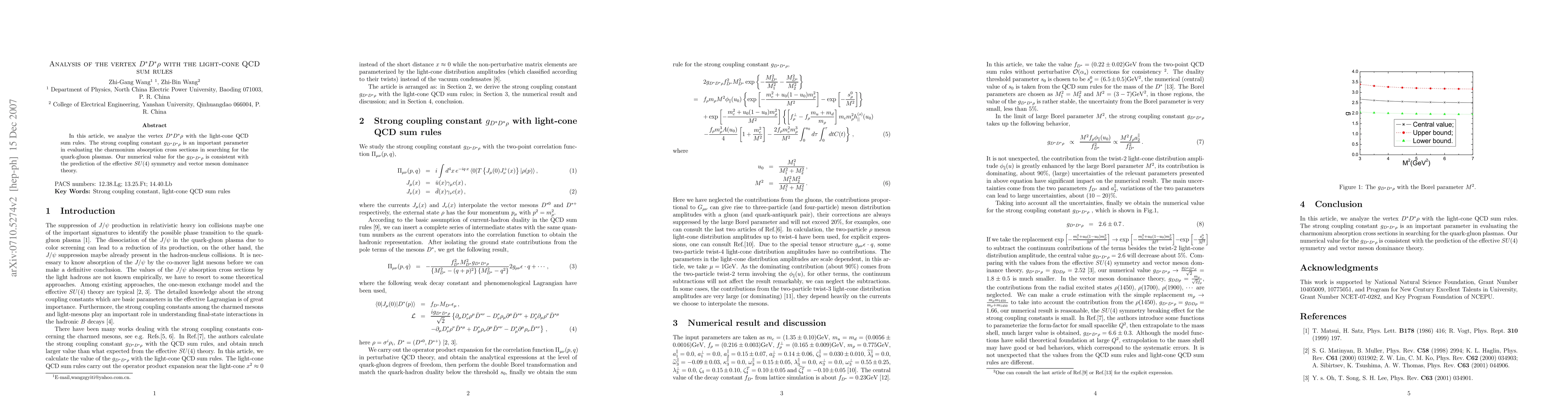 This paper analyzes the $D^*D^*\rho$ vertex using light-cone QCD sum rules to determine the strong coupling constant $g_{D^*D^*\rho}$, crucial for evaluating charmonium absorption cross sections in quark-gluon plasma searches. The obtained value aligns with predictions from effective SU(4) symmetry and vector meson dominance theory.