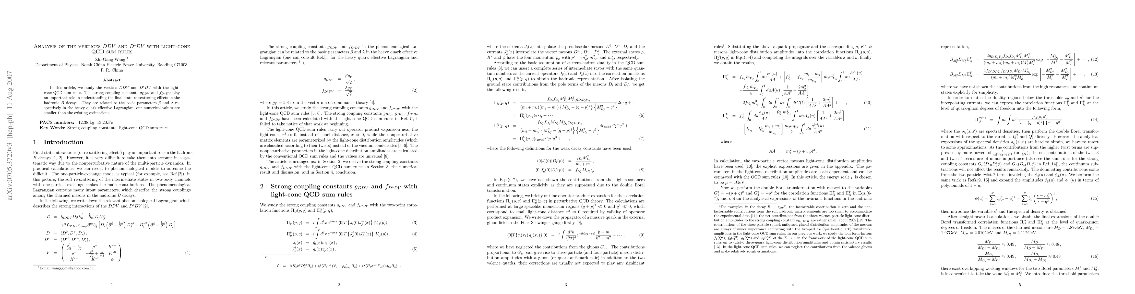 This paper analyzes the vertices $DDV$ and $D^*DV$ using light-cone QCD sum rules to determine the strong coupling constants $g_{DDV}$ and $f_{D^*DV}$, which are crucial for understanding final-state re-scattering in hadronic B decays. The obtained numerical values for these constants are smaller than previous estimations.