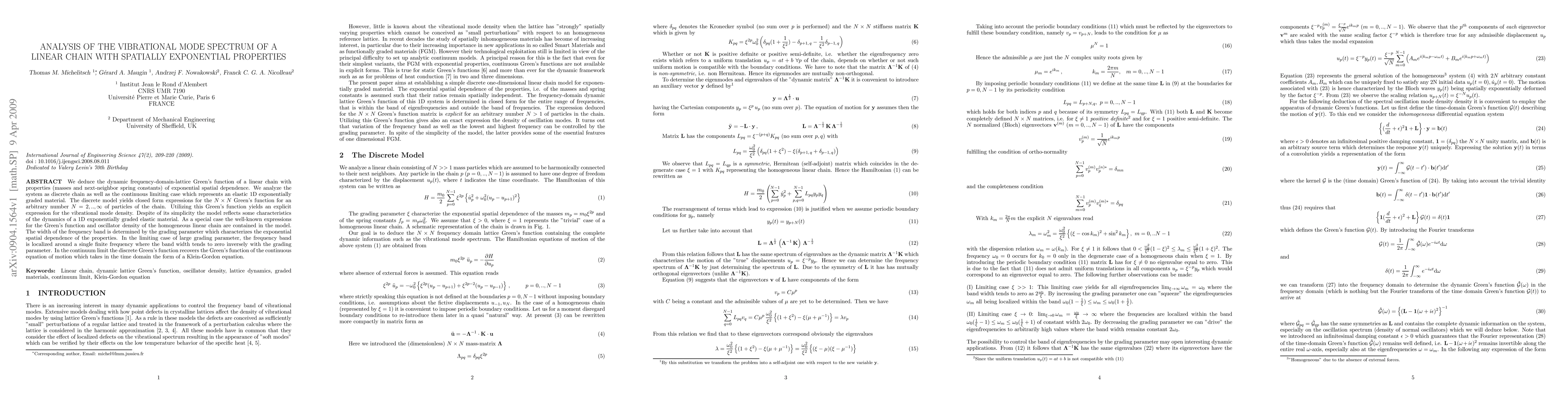 We deduce the dynamic frequency-domain-lattice Green's function of a linear chain with properties (masses and next-neighbor spring constants) of exponential spatial dependence. We analyze the system as discrete chain as well as the continuous limiting case which represents an elastic 1D exponentially graded material. The discrete model yields closed form expressions for the $N \times N$ Green's function for an arbitrary number $N=2,..,\infty$ of particles of the chain. Utilizing this Green's function yields an explicit expression for the vibrational mode density. Despite of its simplicity the model reflects some characteristics of the dynamics of a 1D exponentially graded elastic material. As a special case the well-known expressions for the Green's function and oscillator density of the homogeneous linear chain are contained in the model. The width of the frequency band is determined by the grading parameter which characterizes the exponential spatial dependence of the properties. In the limiting case of large grading parameter, the frequency band is localized around a single finite frequency where the band width tends to zero inversely with the grading parameter. In the continuum limit the discrete Green's function recovers the Green's function of the continuous equation of motion which takes in the time domain the form of a Klein-Gordon equation.