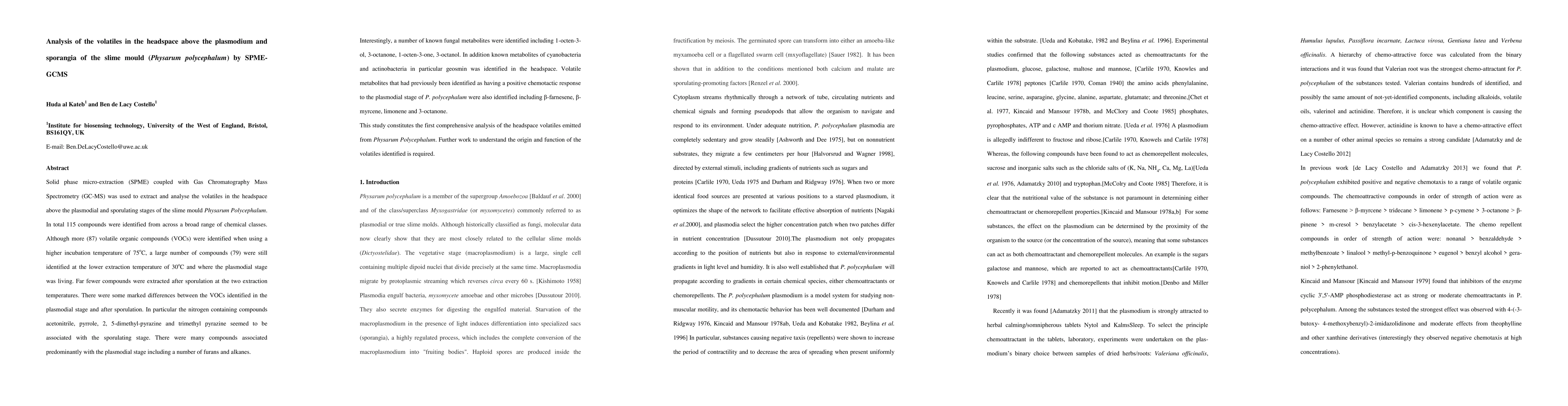 Solid phase micro-extraction (SPME) coupled with Gas Chromatography Mass Spectrometry (GC-MS) was used to extract and analyse the volatiles in the headspace above the plasmodial and sporulating stages of the slime mould Physarum Polycephalum. In total 115 compounds were identified from across a broad range of chemical classes. Although more (87) volatile organic compounds (VOCs) were identified when using a higher incubation temperature of 75oC, a large number of compounds (79) were still identified at the lower extraction temperature of 30oC and where the plasmodial stage was living. Far fewer compounds were extracted after sporulation at the two extraction temperatures. There were some marked differences between the VOCs identified in the plasmodial stage and after sporulation. In particular the nitrogen containing compounds acetonitrile, pyrrole, 2, 5-dimethyl-pyrazine and trimethyl pyrazine seemed to be associated with the sporulating stage. There were many compounds associated predominantly with the plasmodial stage including a number of furans and alkanes. Interestingly, a number of known fungal metabolites were identified including 1-octen-3-ol, 3-octanone, 1-octen-3-one, 3-octanol. In addition known metabolites of cyanobacteria and actinobacteria in particular geosmin was identified in the headspace. Volatile metabolites that had previously been identified as having a positive chemotactic response to the plasmodial stage of P. polycephalum were also identified including {\beta}-farnesene, {\beta}-myrcene, limonene and 3-octanone. This study constitutes the first comprehensive analysis of the headspace volatiles emitted from Physarum Polycephalum. Further work to understand the origin and function of the volatiles identified is required.