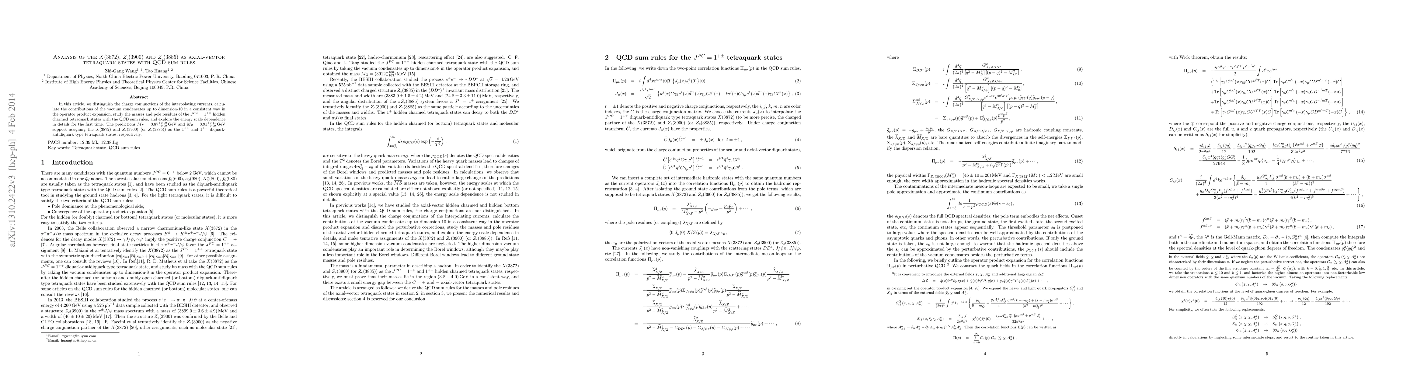 In this article, we distinguish the charge conjunctions of the interpolating currents, calculate the contributions of the vacuum condensates up to dimension-10 in a consistent way in the operator product expansion, study the masses and pole residues of the $J^{PC}=1^{+\pm}$ hidden charmed tetraquark states with the QCD sum rules, and explore the energy scale dependence in details for the first time. The predictions $M_{X}=3.87^{+0.09}_{-0.09}\,\rm{GeV}$ and $M_{Z}=3.91^{+0.11}_{-0.09}\,\rm{GeV}$ support assigning the $X(3872)$ and $Z_c(3900)$ (or $Z_c(3885)$) as the $1^{++}$ and $1^{+-}$ diquark-antidiquark type tetraquark states, respectively.