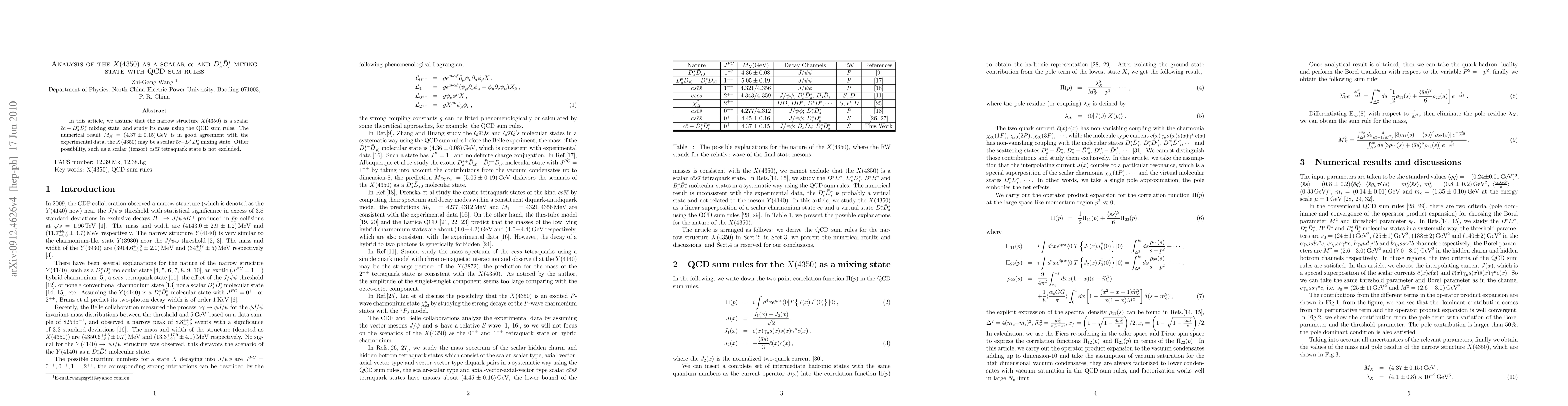This paper proposes that the X(4350) particle is a scalar $\bar{c}c$-${D}_s^\ast {\bar {D}}_s^\ast$ mixing state, and uses QCD sum rules to determine its mass, yielding $M_X=(4.37\pm0.15)\,\rm{GeV}$, which aligns well with experimental data. Other tetraquark configurations, like $cs\bar{c}\bar{s}$, remain possible.