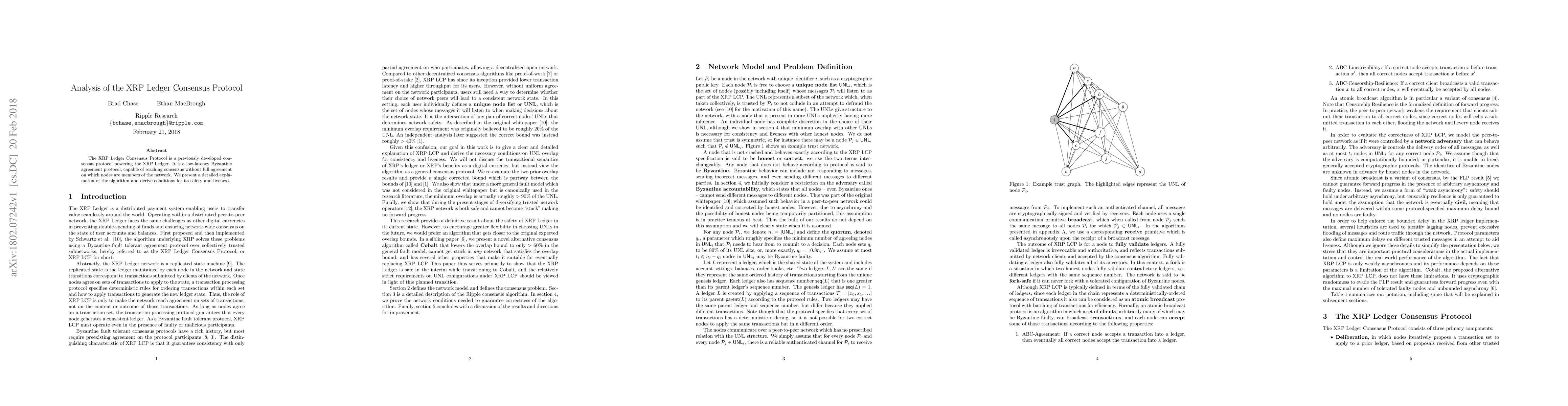Summary: This paper analyzes the XRP Ledger Consensus Protocol, detailing its low-latency Byzantine agreement mechanism and deriving conditions for its safety and liveness, despite not requiring full network membership agreement.