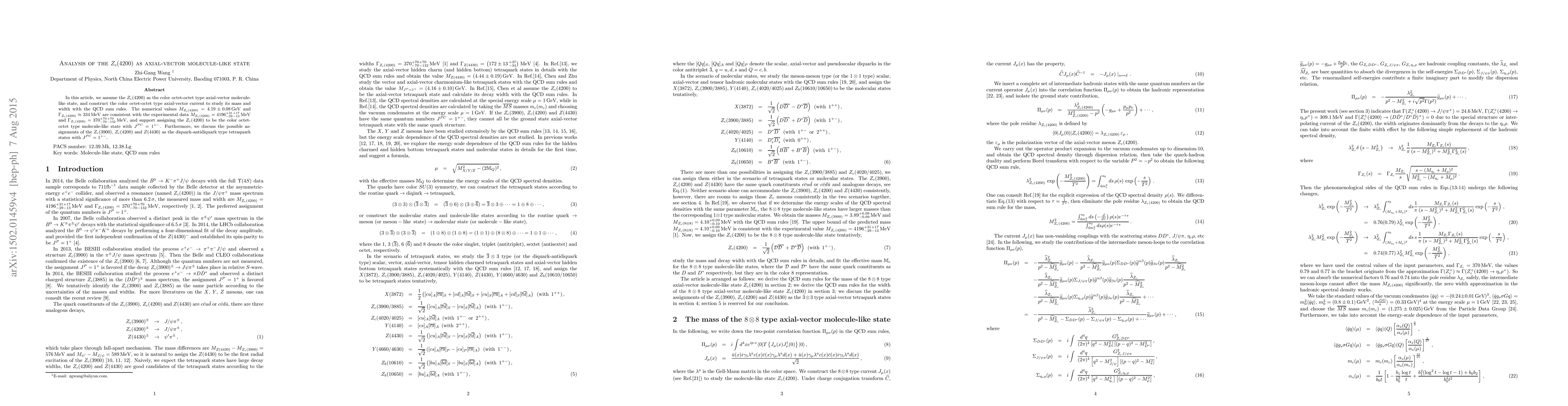 In this article, we assume the $Z_c(4200)$ as the color octet-octet type axial-vector molecule-like state, and construct the color octet-octet type axial-vector current to study its mass and width with the QCD sum rules. The numerical values $M_{Z_c(4200)}=4.19 \pm 0.08\,\rm{GeV}$ and $\Gamma_{Z_c(4200)}\approx 334\,\rm{MeV}$ are consistent with the experimental data $M_{Z_c(4200)} = 4196^{+31}_{-29}{}^{+17}_{-13} \,\rm{MeV}$ and $\Gamma_{Z_c(4200)} = 370^{+70}_{-70}{}^{+70}_{-132}\,\rm{MeV}$, and support assigning the $Z_c(4200)$ to be the color octet-octet type molecule-like state with $J^{PC}=1^{+-}$. Furthermore, we discuss the possible assignments of the $Z_c(3900)$, $Z_c(4200)$ and $Z(4430)$ as the diquark-antidiquark type tetraquark states with $J^{PC}=1^{+-}$.