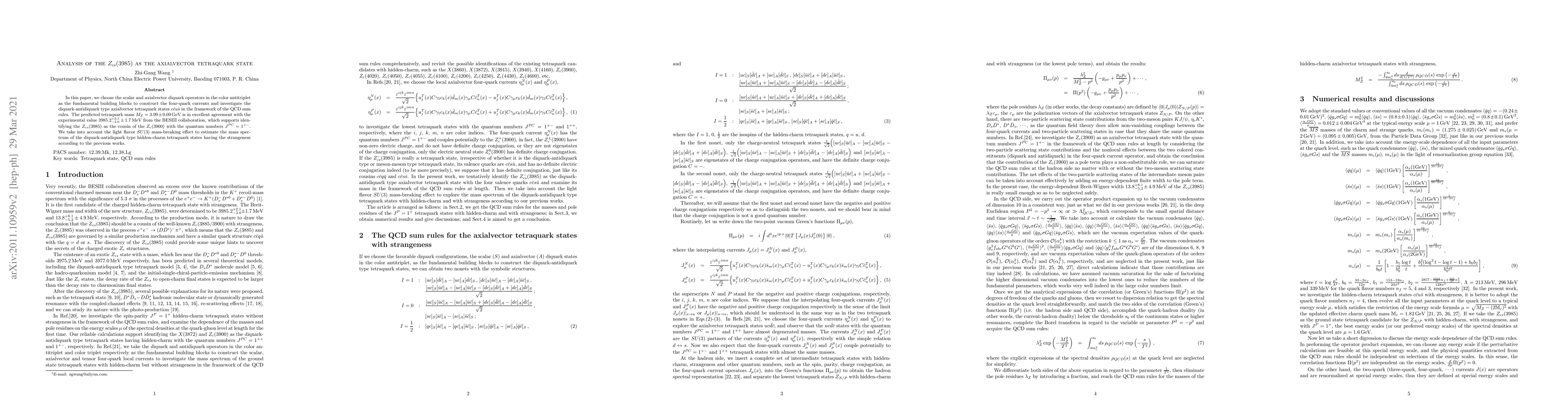 This paper constructs four-quark currents using scalar and axialvector diquark operators to explore the $Z_{cs}(3985)$ axialvector tetraquark state within QCD sum rules, predicting a mass that closely matches experimental data, supporting its identification as a hidden-charm tetraquark. The study also considers the $SU(3)$ mass-breaking effect for the mass spectrum of similar tetraquarks.