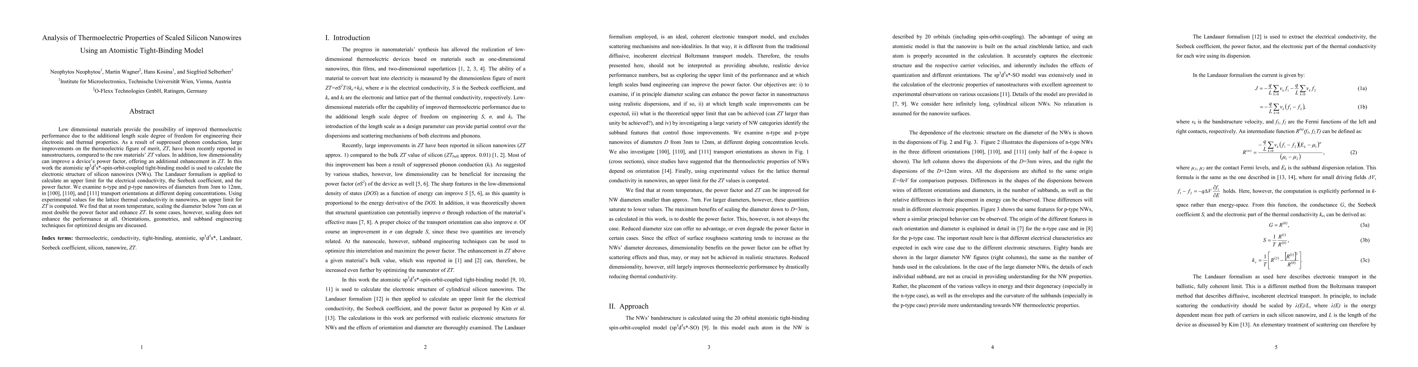 This paper analyzes the thermoelectric properties of silicon nanowires using an atomistic tight-binding model, finding that reducing the diameter below 7nm can double the power factor and enhance the thermoelectric figure of merit ZT, though performance depends on orientation, geometry, and doping.