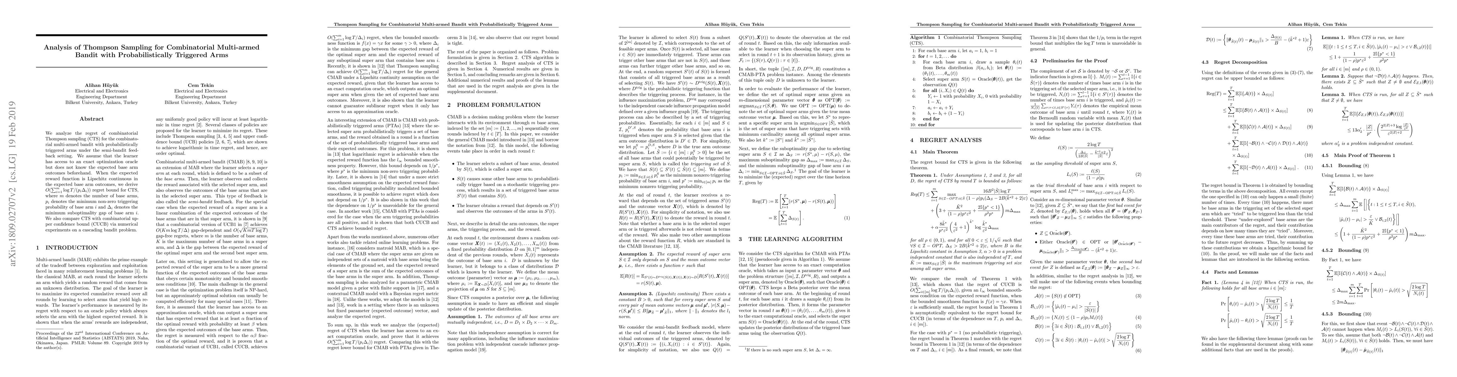 This paper analyzes the regret of combinatorial Thompson sampling (CTS) for combinatorial multi-armed bandit problems with probabilistically triggered arms, deriving an $O(\sum_{i =1}^m \log T / (p_i \Delta_i))$ regret bound under certain conditions. It also compares CTS with CUCB through numerical experiments on a cascading bandit problem.