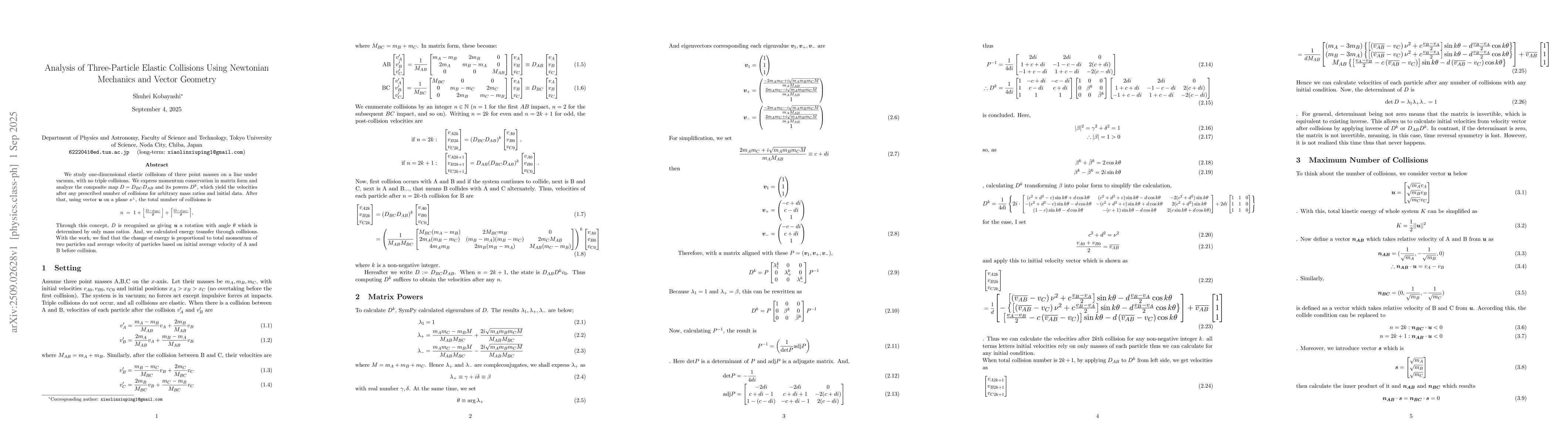 We study one-dimensional elastic collisions of three point masses on a line under vacuum, with no triple collisions. We express momentum conservation in matrix form and analyze the composite map $D=D_{BC}D_{AB}$ and its powers $D^k$, which yield the velocities after any prescribed number of collisions for arbitrary mass ratios and initial data. After that, using vector $u$ on a plane $s^\perp$, the total number of collisions is \[ n\;=\;1+\Big\lfloor\tfrac{\Omega-\phi_{BC}}{\theta}\Big\rfloor+\Big\lceil\tfrac{\Omega-\phi_{BC}}{\theta}\Big\rceil, \] Through this concept, $D$ is recognised as giving $u$ a rotation with angle $\theta$ which is determined by only mass ratios. And, we calculated energy transfer through collisions. With the work, we find that the change of energy is proportional to total momentum of two particles and average velocity of particles based on initial average velocity of A and B before collision.