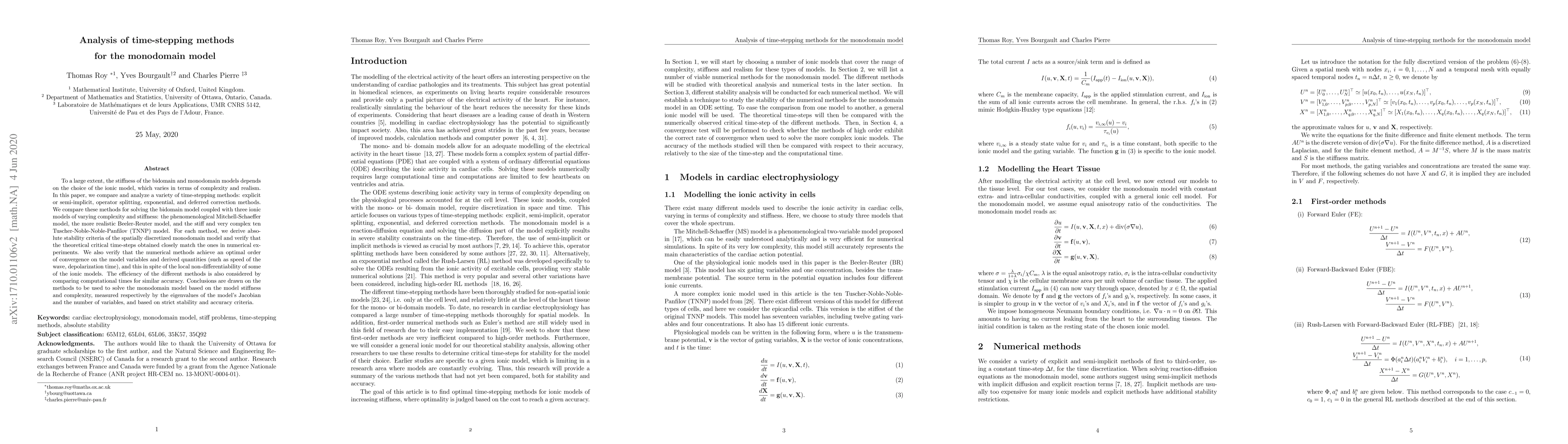 The paper presents a detailed analysis of stability criteria for various time-stepping methods applied to the monodomain model, including derivations and numerical verifications.