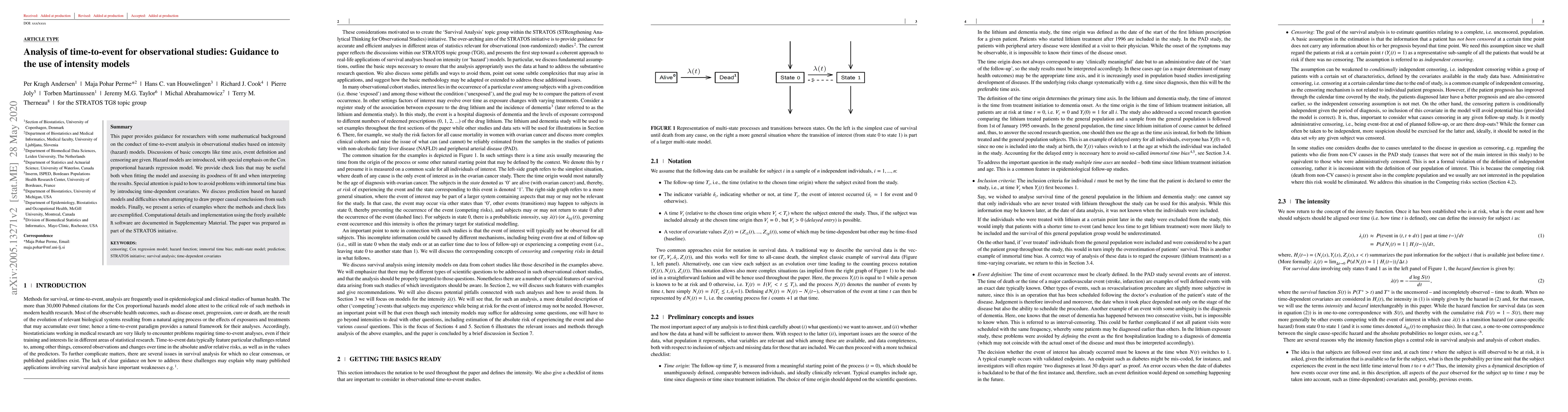 This paper provides guidance for researchers with some mathematical background on the conduct of time-to-event analysis in observational studies based on intensity (hazard) models. Discussions of basic concepts like time axis, event definition and censoring are given. Hazard models are introduced, with special emphasis on the Cox proportional hazards regression model. We provide check lists that may be useful both when fitting the model and assessing its goodness of fit and when interpreting the results. Special attention is paid to how to avoid problems with immortal time bias by introducing time-dependent covariates. We discuss prediction based on hazard models and difficulties when attempting to draw proper causal conclusions from such models. Finally, we present a series of examples where the methods and check lists are exemplified. Computational details and implementation using the freely available R software are documented in Supplementary Material. The paper was prepared as part of the STRATOS initiative.
