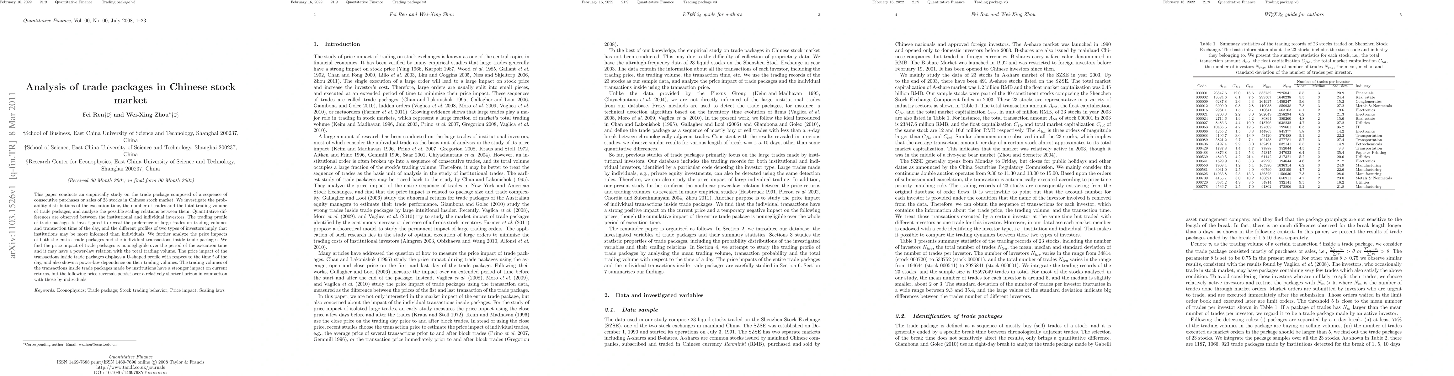 This paper conducts an empirically study on the trade package composed of a sequence of consecutive purchases or sales of 23 stocks in Chinese stock market. We investigate the probability distributions of the execution time, the number of trades and the total trading volume of trade packages, and analyze the possible scaling relations between them. Quantitative differences are observed between the institutional and individual investors. The trading profile of trade packages is investigated to reveal the preference of large trades on trading volumes and transaction time of the day, and the different profiles of two types of investors imply that institutions may be more informed than individuals. We further analyze the price impacts of both the entire trade packages and the individual transactions inside trade packages. We find the price impact of trade packages is nonnegligible over the period of the execution time and it may have a power-law relation with the total trading volume. The price impact of the transactions inside trade packages displays a U-shaped profile with respect to the time $t$ of the day, and also shows a power-law dependence on their trading volumes. The trading volumes of the transactions inside trade packages made by institutions have a stronger impact on current returns, but the following price reversals persist over a relatively shorter horizon in comparison with those by individuals.
