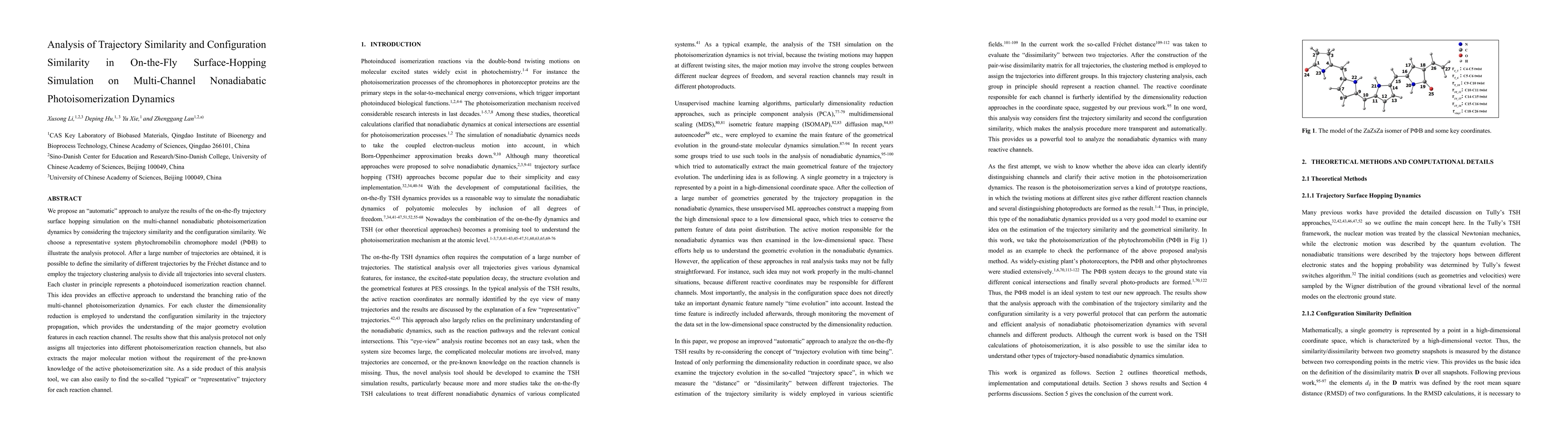 This paper proposes an automatic method to analyze on-the-fly surface hopping simulations of multi-channel nonadiabatic photoisomerization dynamics, using trajectory similarity and configuration similarity. The method clusters trajectories based on the Fréchet distance, revealing distinct photoisomerization reaction channels and major molecular geometry evolution features.