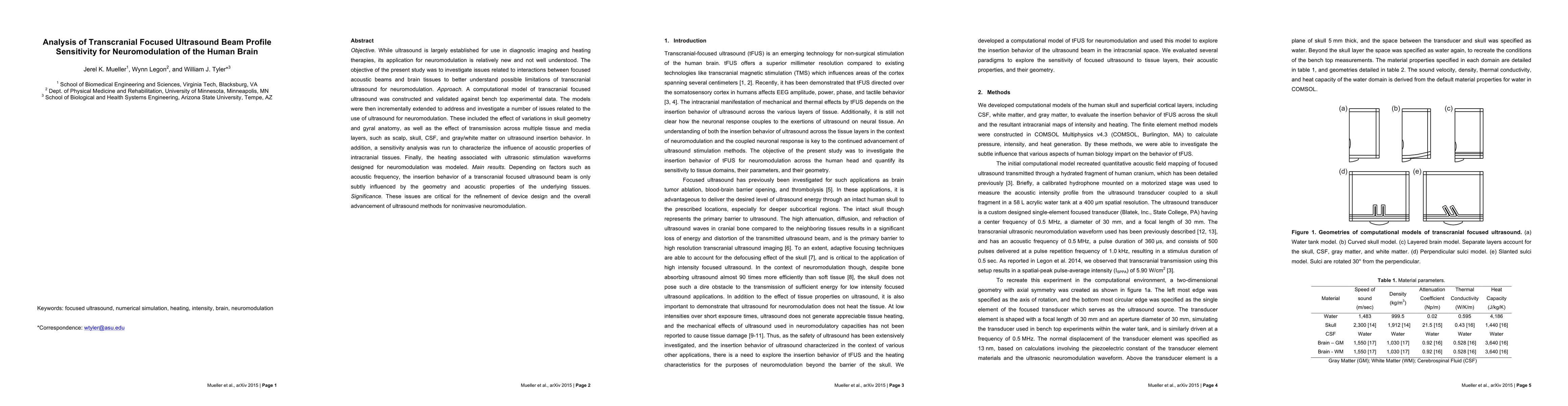 This study investigates the interaction of focused ultrasound beams with brain tissues for neuromodulation, using computational models validated against experimental data. It finds that while ultrasound neuromodulation is promising, its behavior is only subtly influenced by skull geometry and tissue properties, highlighting the need for refined device design.