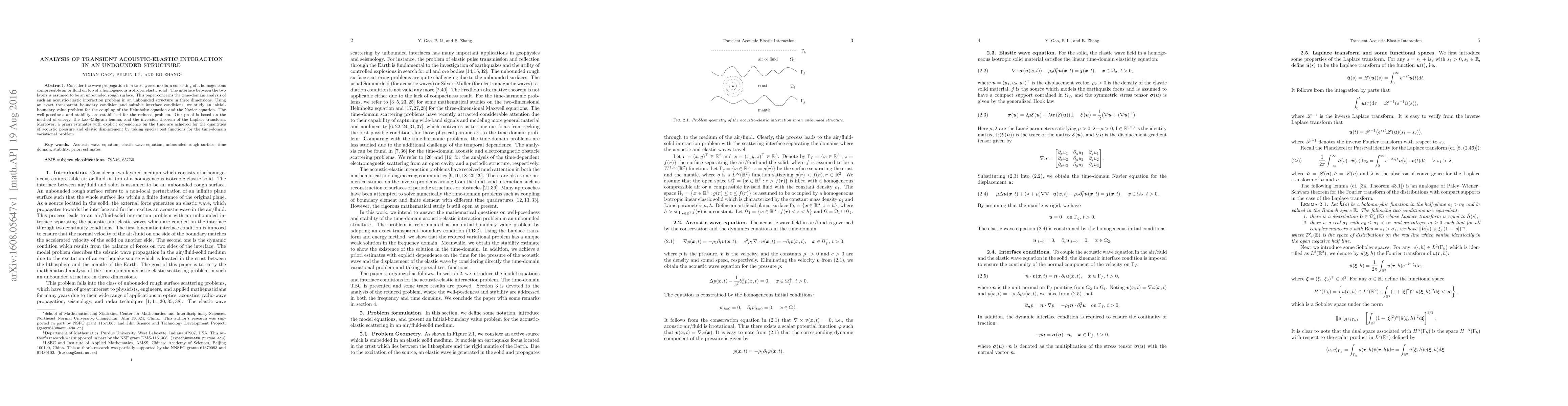 Consider the wave propagation in a two-layered medium consisting of a homogeneous compressible air or fluid on top of a homogeneous isotropic elastic solid. The interface between the two layers is assumed to be an unbounded rough surface. This paper concerns the time-domain analysis of such an acoustic-elastic interaction problem in an unbounded structure in three dimensions. Using an exact transparent boundary condition and suitable interface conditions, we study an initial-boundary value problem for the coupling of the Helmholtz equation and the Navier equation. The well-posedness and stability are established for the reduced problem. Our proof is based on the method of energy, the Lax--Milgram lemma, and the inversion theorem of the Laplace transform. Moreover, a priori estimates with explicit dependence on the time are achieved for the quantities of acoustic pressure and elastic displacement by taking special test functions for the time-domain variational problem.