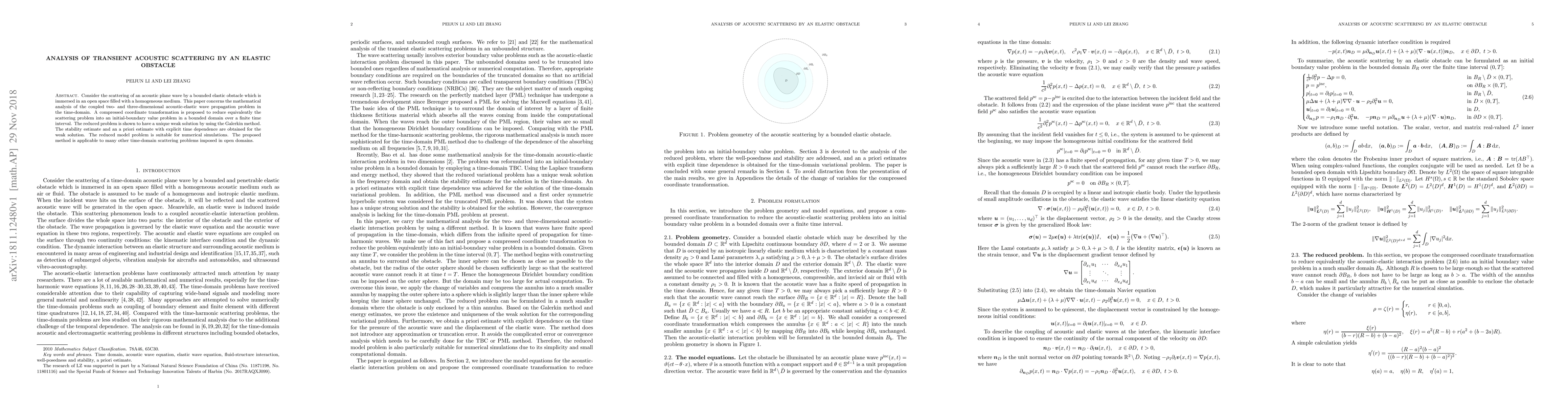 This paper analyzes the transient acoustic scattering by an elastic obstacle using a mathematical approach to solve the coupled acoustic-elastic wave propagation problem in the time-domain. A compressed coordinate transformation simplifies the problem into an initial-boundary value problem, ensuring a unique weak solution with stability and explicit time dependence estimates, suitable for numerical simulations.
