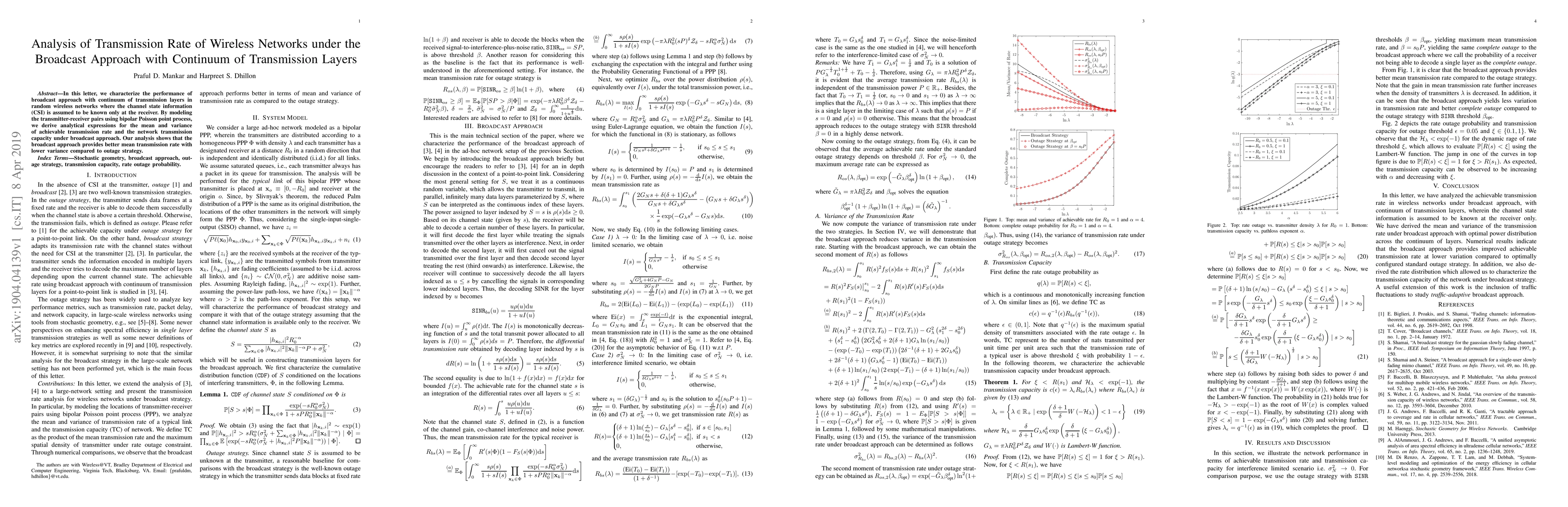 This paper analyzes the performance of a broadcast approach with a continuum of transmission layers in random wireless networks, deriving analytical expressions for mean and variance of transmission rates and network capacity. The study finds that the broadcast approach offers better mean transmission rates with lower variance compared to an outage strategy.