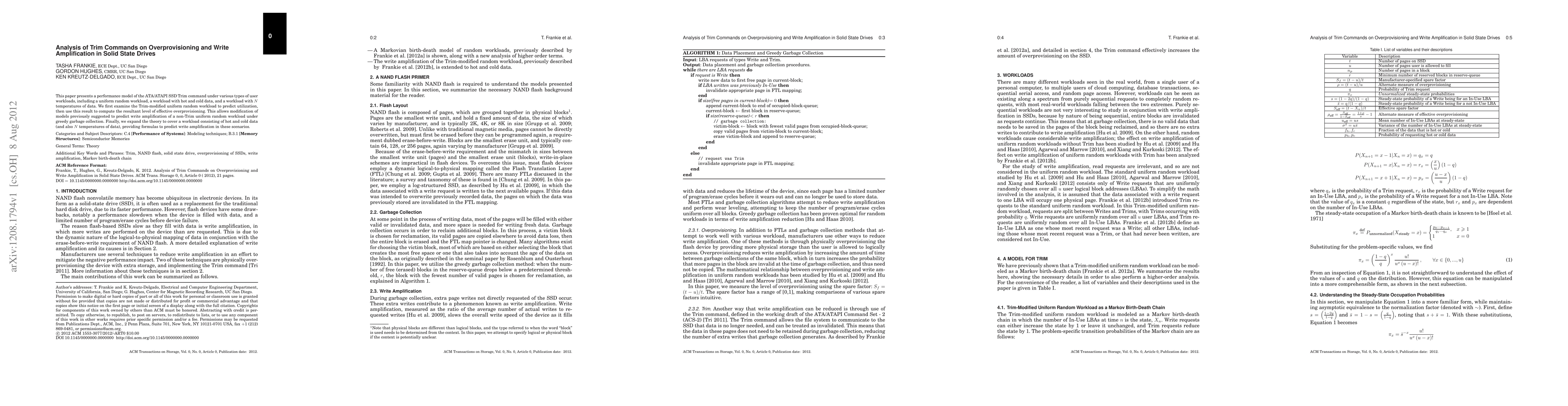 Researchers analyzed Trim commands on solid state drives to predict overprovisioning and write amplification under various workloads, including uniform random, hot/cold data, and multiple temperatures. The study provides new formulas to calculate write amplification in these scenarios, helping optimize SSD performance and lifespan.
