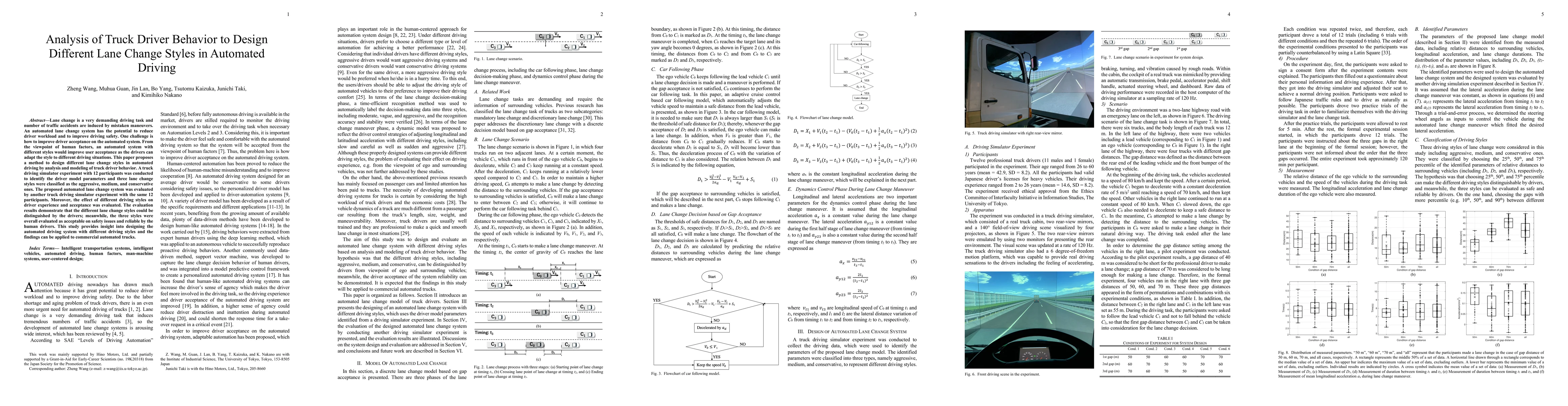 This paper analyzes truck driver behavior to design various lane change styles for automated driving systems, aiming to improve driver acceptance. Experiments with a truck simulator showed that drivers could distinguish between aggressive, medium, and conservative lane change styles, which were deemed acceptable in terms of safety and reliability.