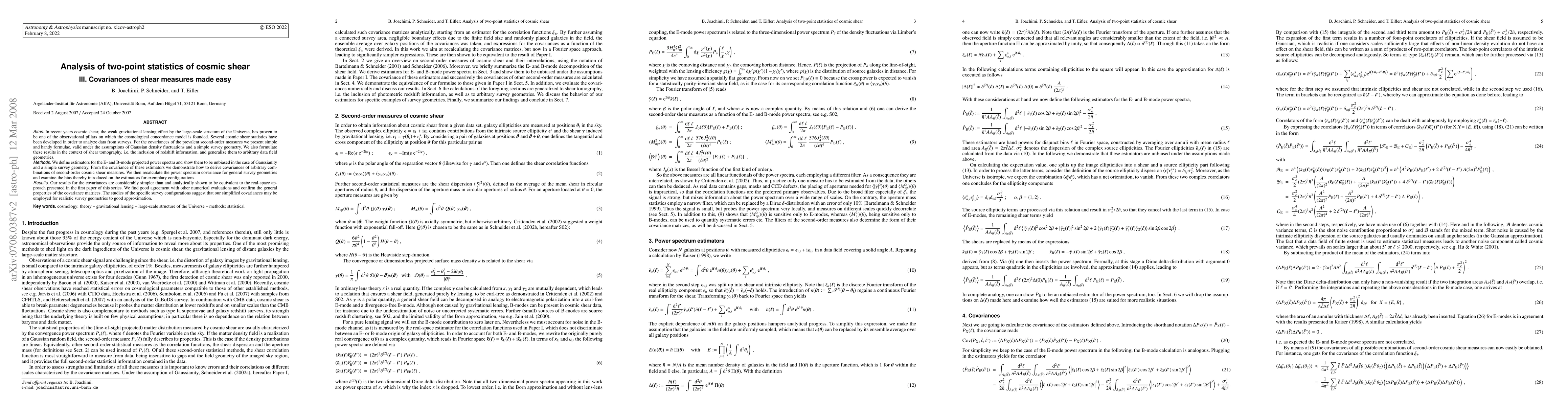 This paper presents simplified formulae for the covariances of second-order cosmic shear measures, valid under Gaussian assumptions and simple survey geometries. It also generalizes these results to include redshift information and arbitrary survey geometries, demonstrating their equivalence to real-space approaches and confirming their applicability to realistic survey configurations.